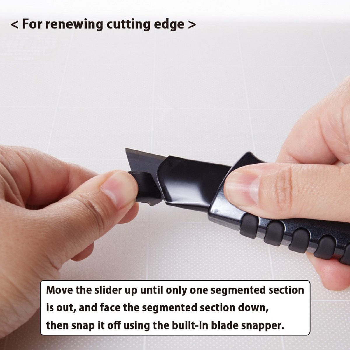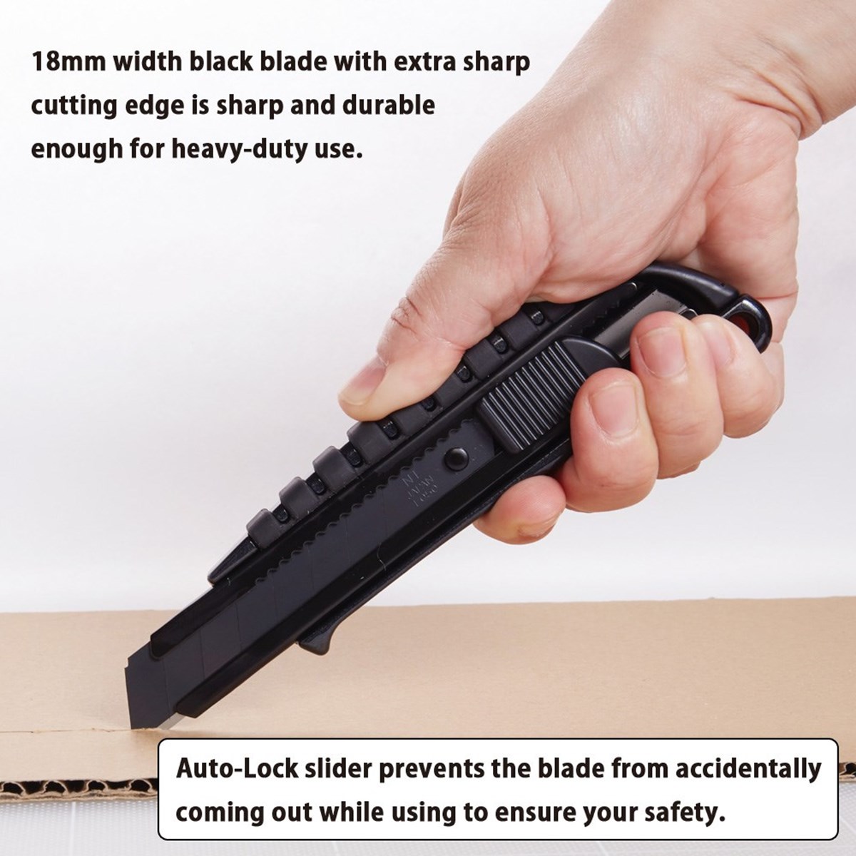 Hållbart och lätt grepp i gjuten aluminium – Auto-lock skjutreglage (spärrlås-skjutreglage). Extra vasst 18 mm blad.