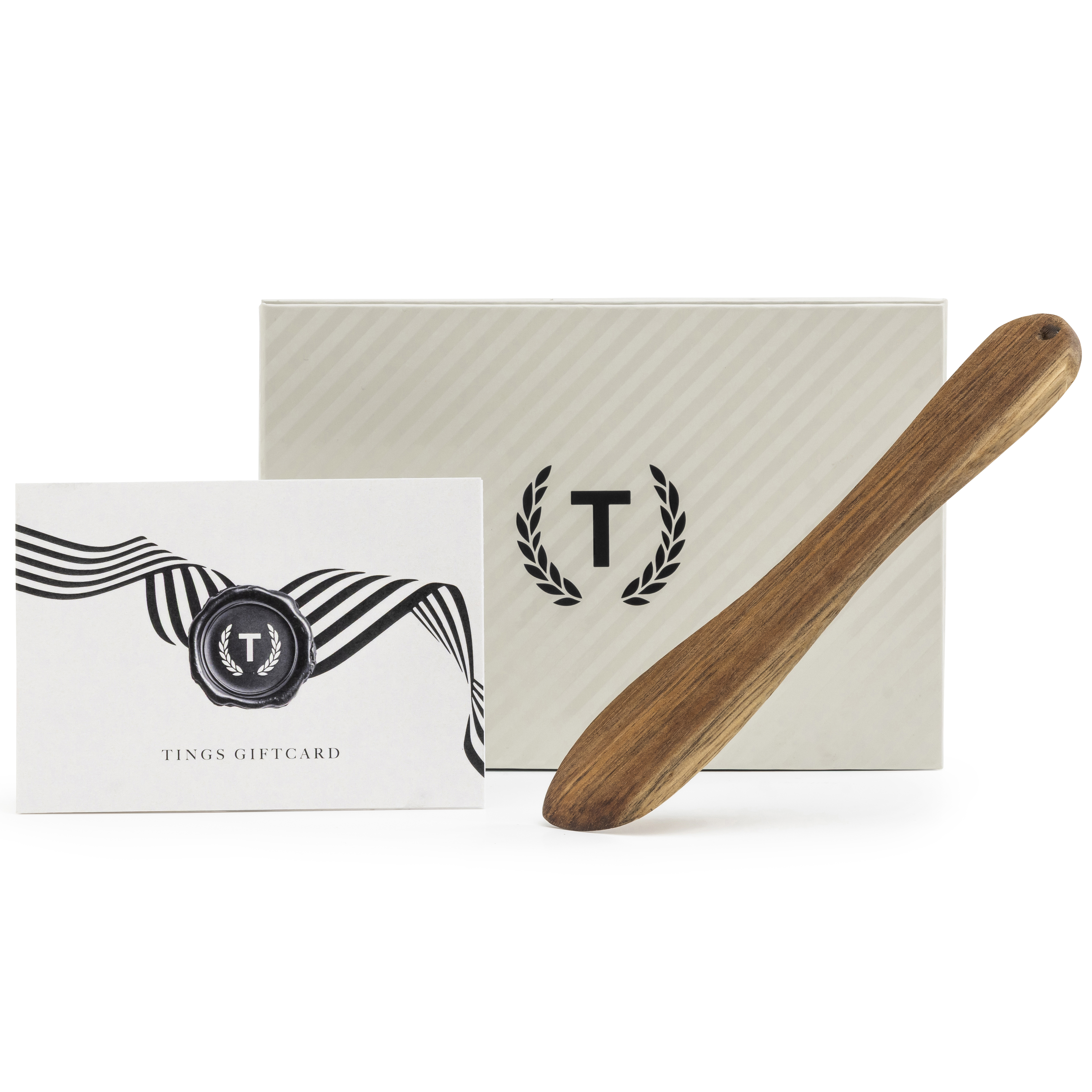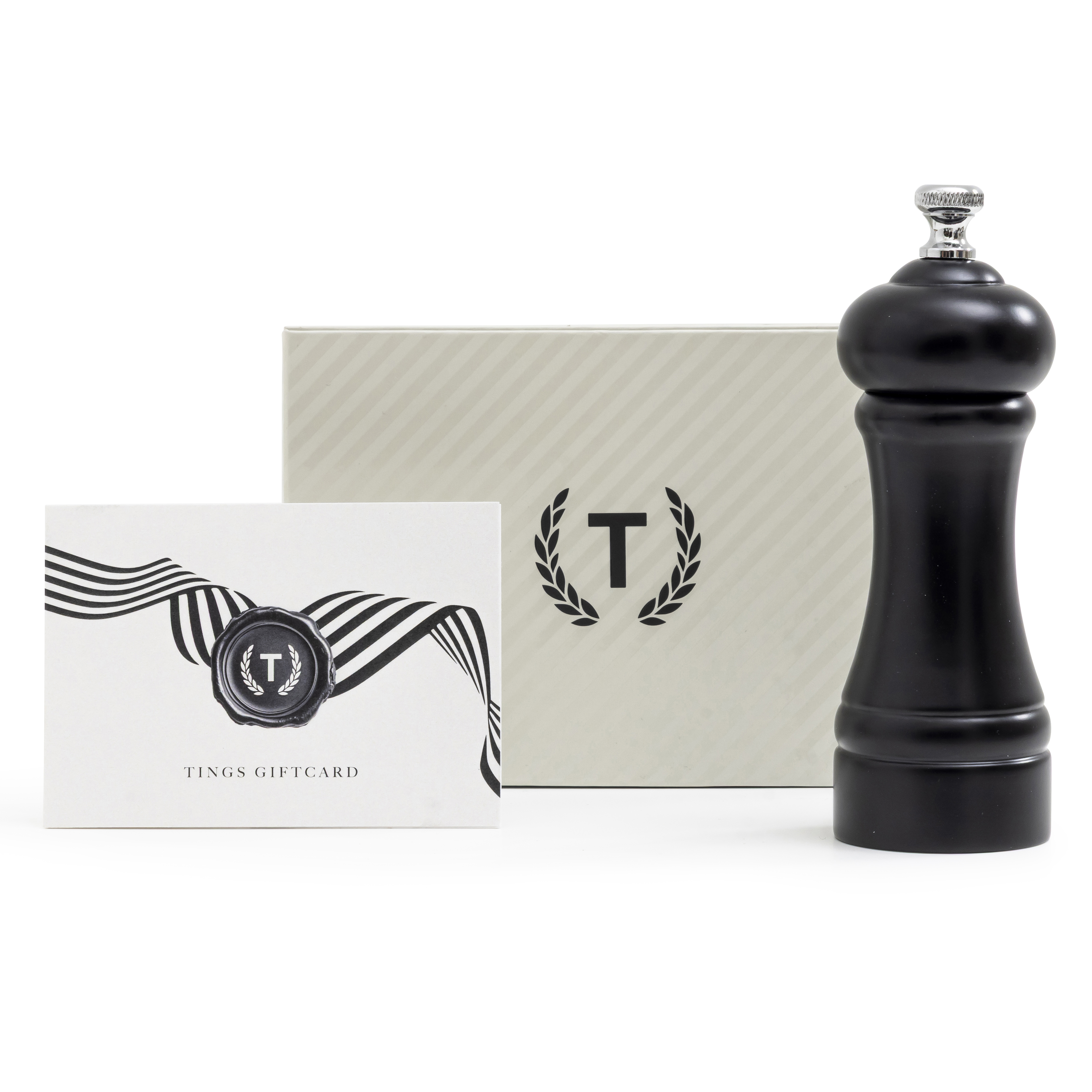 Ett exklusivt gåvokort med massor av kökstillbehör, inredning för hemmet och fritidsprodukter som passar alla och som väljs på Tingsgiftcard.se med en kod som mottagaren får i kortet. Gåvokortet ligger förpackat i en exklusiv giftbox med en extragåva och ett julkort.