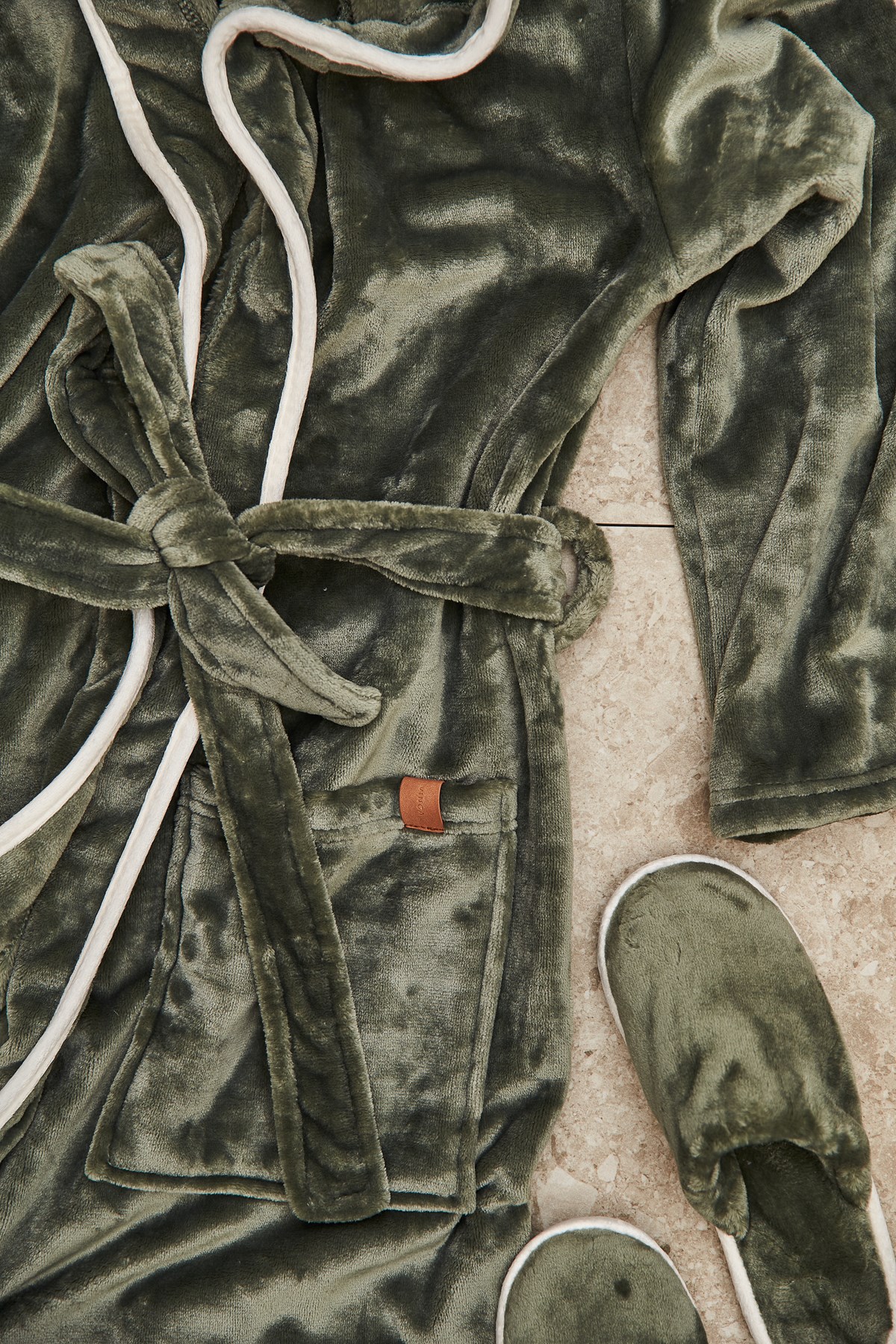 Mysig och mjuk morgonrock i luxury plush med stor huva och dekorativ piping. Två fickor framtill och skärp i midjan. Tillverkad av 70 % återvunnet material från PET-flaskor. OEKO-TEX Standard 100.