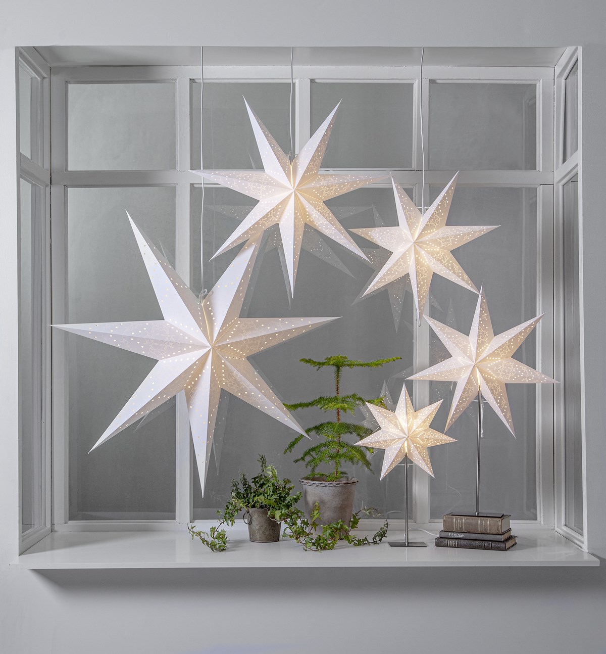 Mönstrad pappersstjärna i vit design. Fin stjärna att dekorera med i fönstret. Inkl. 3,5 m kabel, exkl. ljuskälla (E14). Mått: 70 x 70 cm.