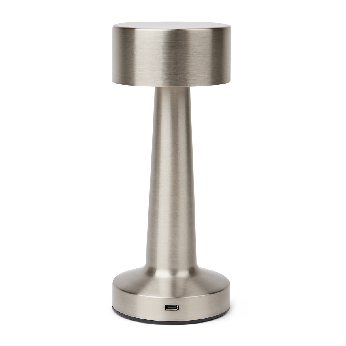 Skapa en mysig atmosfär med vår bordslampa. Tillverkad av metall och återvunnen ABS. Lampan har en lystid på upp till 8 timmar. Växla enkelt mellan varmt ljus, vitt ljus och varmvitt ljus med touchknappen och justera ljusstyrkan med en lång tryckning. Laddas via USB-C, kabel medföljer. Höjd: 21,5 cm, bredd: 9 cm.