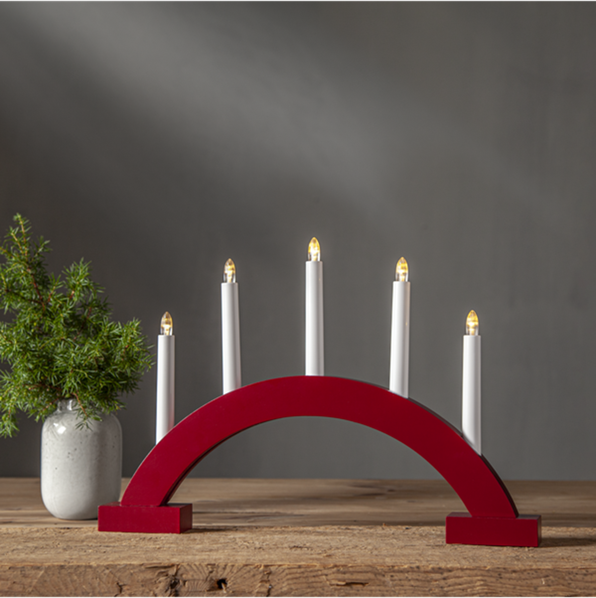 Batteridriven bågformad adventsljusstake tillverkad i trä. Ljusstaken är liten och nätt och därför lättplacerad i både fönster och på skänk. LED-lampor som lyser fint och skapar julkänsla i hemmet eller på kontoret. Höjd 32 cm, bredd 46 cm. Drivs med 2 st AA-batterier (ingår ej). Timerfunktion. Denna produkt har FSC®-märkning.