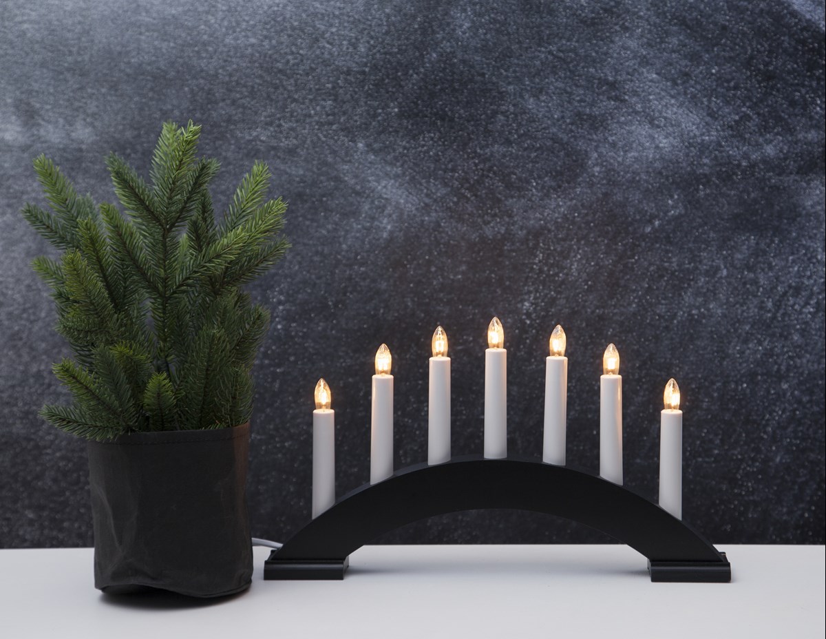 Träljusstake i bågform med 7 ljuskällor. En vacker ljusstake med härligt sken. Placera ljusstaken exempelvis i fönstret för att skapa en härlig adventstämning i hemmet. BxH: 39x22 cm.