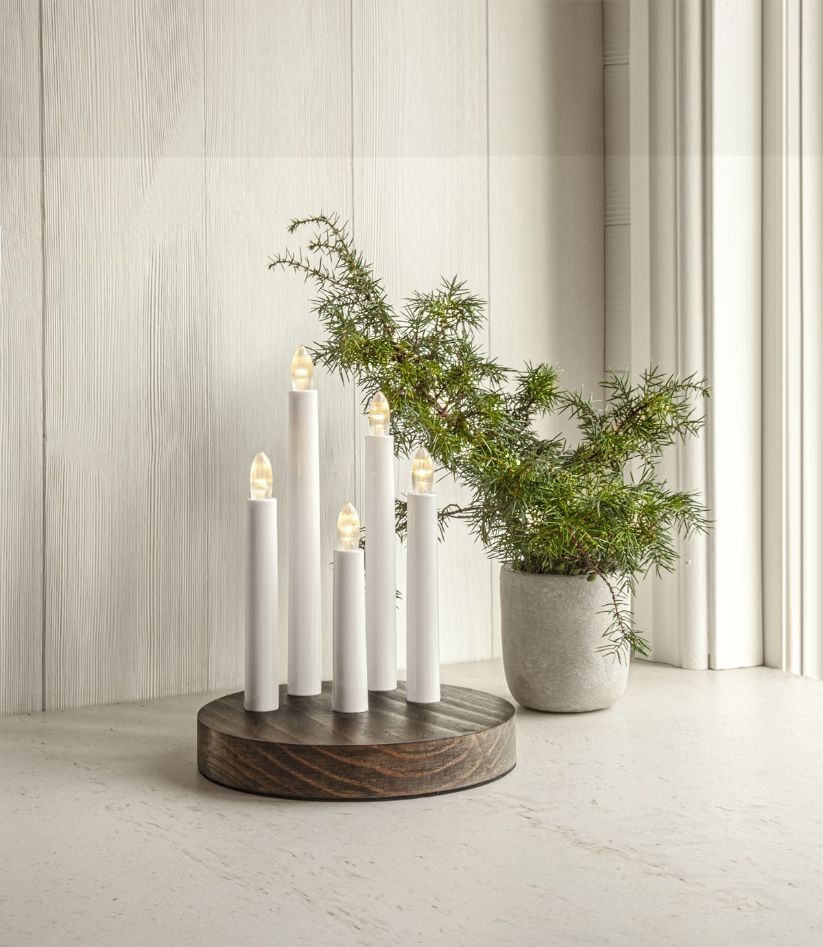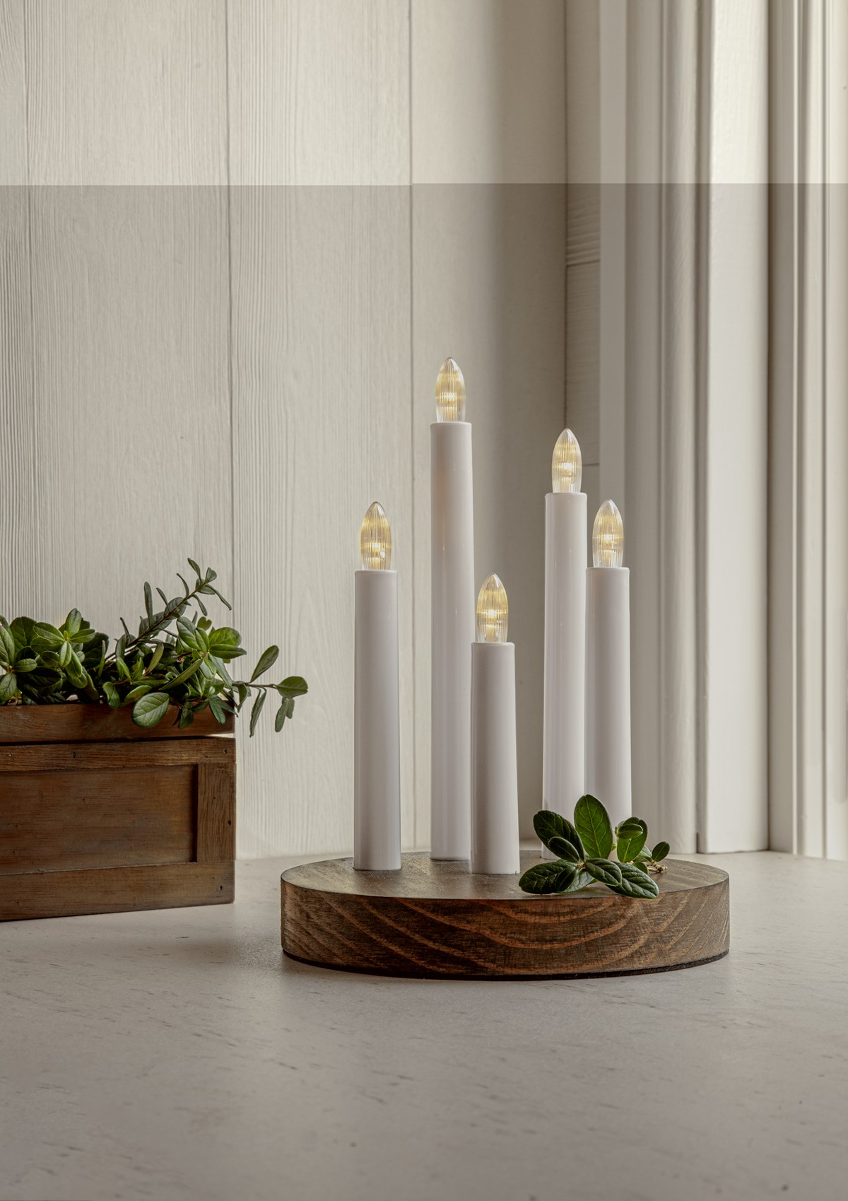 Batteridriven adventsljusstake tillverkad i trä. Ljusstaken är liten och nätt och därför lättplacerad i både fönster och på skänk. LED-lampor som lyser fint och skapar julkänsla i hemmet. Batterier ingår ej (drivs med 2 AA-batterier). Brinntid ca 400 timmar. Höjd 24 cm, bredd 17,5 cm.