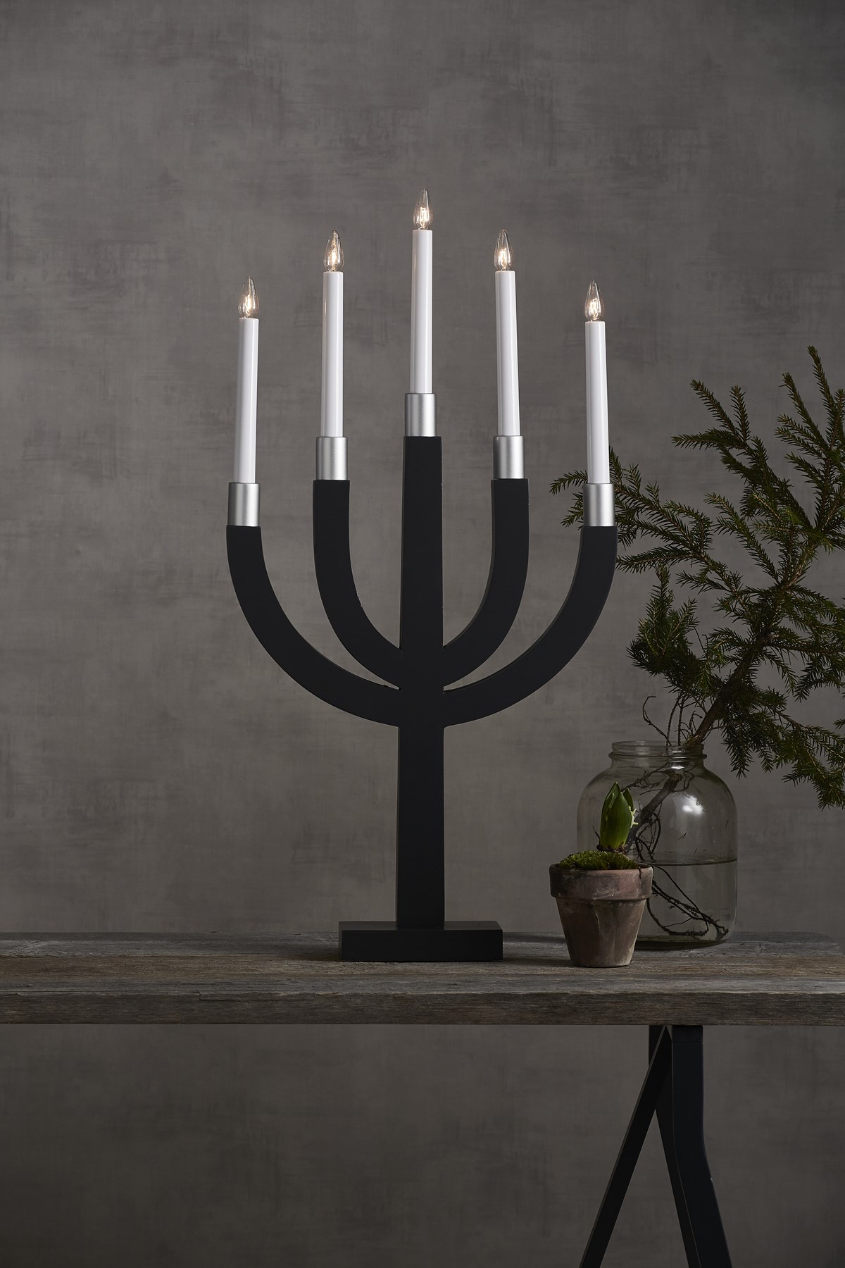 Träljusstake med mässingsbas på ljusen. Placera ljusstaken exempelvis i fönstret för att skapa en härlig adventstämning i hemmet. Anslutningskabeln är vit. BxH 35x67 cm.