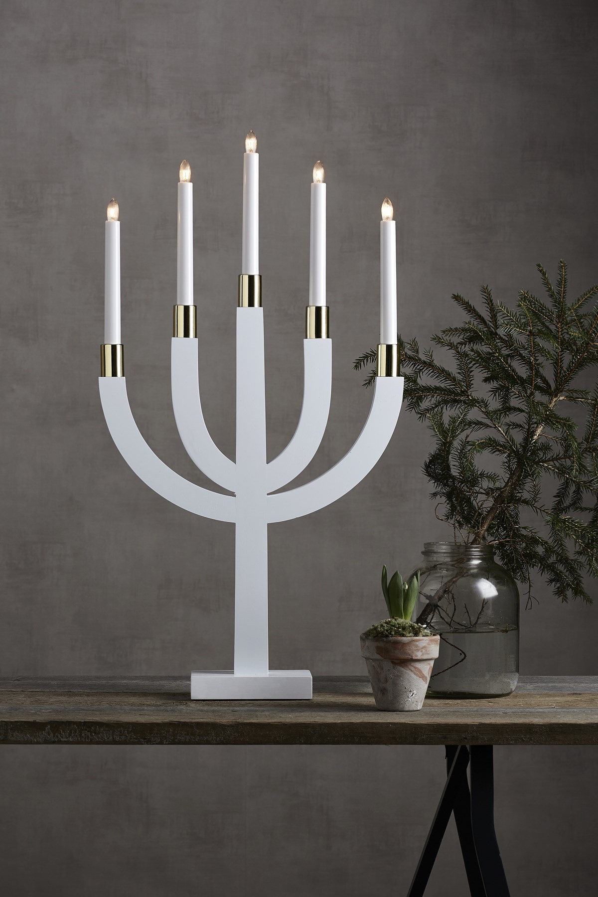 Träljusstake med mässingsbas på ljusen. Placera ljusstaken exempelvis i fönstret för att skapa en härlig adventstämning i hemmet. Anslutningskabeln är vit. BxH 35x67 cm.