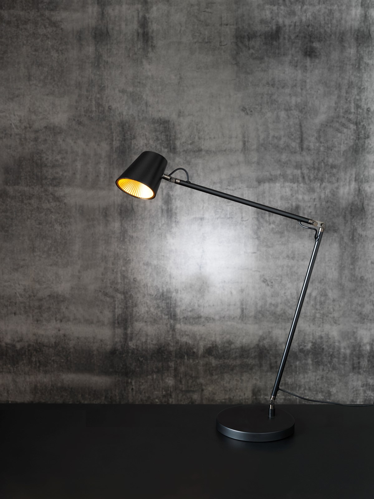Lampa i svart med guldfärgad reflektor på insidan av skärmen som ger ett varmt och behagligt arbetsljus. 3-ledad arm, ställbart lamphuvud och 3-stegs touchdimmer. En lampa som passar såväl på kontor som hotell och i liknande miljöer. 9 W LED. 1630 lux. Armlängd 400 + 300 mm.