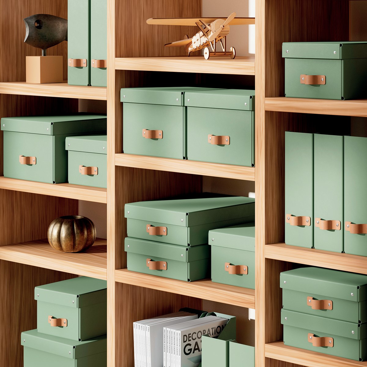 Leitz hyllförvaringsboxar levereras flatpackade och är snabba och enkla att montera utan verktyg. Dessa stapelbara förvaringslådor är skonsamma mot planeten och tillverkade av 100 % återvunnen FSC-certifierad kartong och kan demonteras helt för 100 % återvinning efter användning.urvalet av jordnära färger - inspirerade av naturens renhet och enkelhet - passar perfekt till din inredning och ger en känsla av lugn i dina rum och på kontoret. Varje förvaringslåda har ett draghandtag i läder som gör dem lätta att ta fram från hyllor och förvaringsenheter. Tillverkad i Italien.