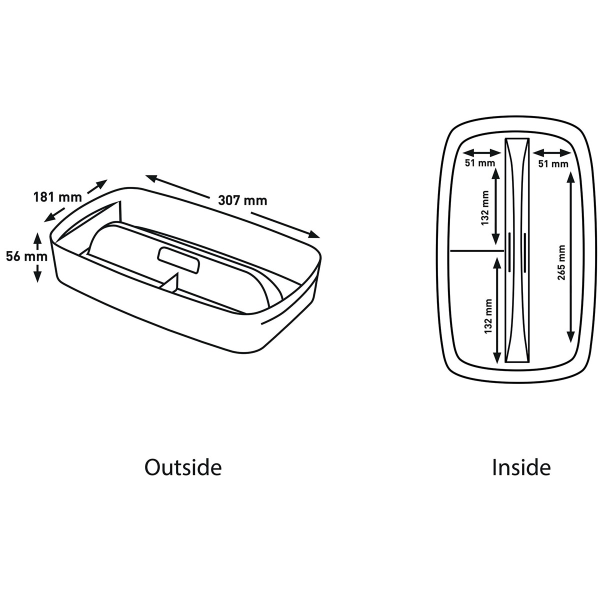 Universellt organiseringsfack för att hålla ordning på sina föremål och göra dem lättillgängliga. Kombinerat med Leitz MyBox Large eller Small är detta den optimala förvaringslösningen. Tillverkad av robust, reptåligt och vattentätt plastmaterial för en förstklassig finish. Livsmedelssäker. Fri från BPA. Med ett handtag för enkel åtkomst. När den används inuti en MyBox vilar organiseringsfacket på boxens övre kant så att förvaringsutrymmet under behålls. När du inte använder facken kan de staplas inuti varandra för att spara utrymme. Format: 307 x 56 x 181 mm.