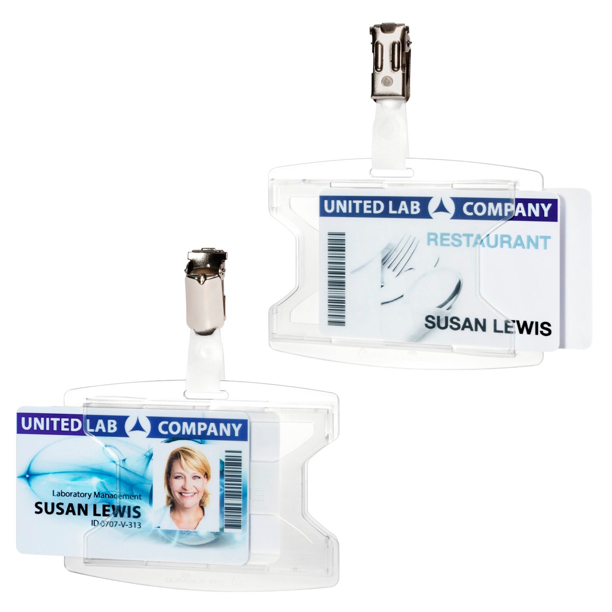Levereras med ett vridbart hängselclips, som gör att ID-kortet alltid hänger rakt. Kan användas i liggande eller stående format. För standardkort ca 54x85 mm.