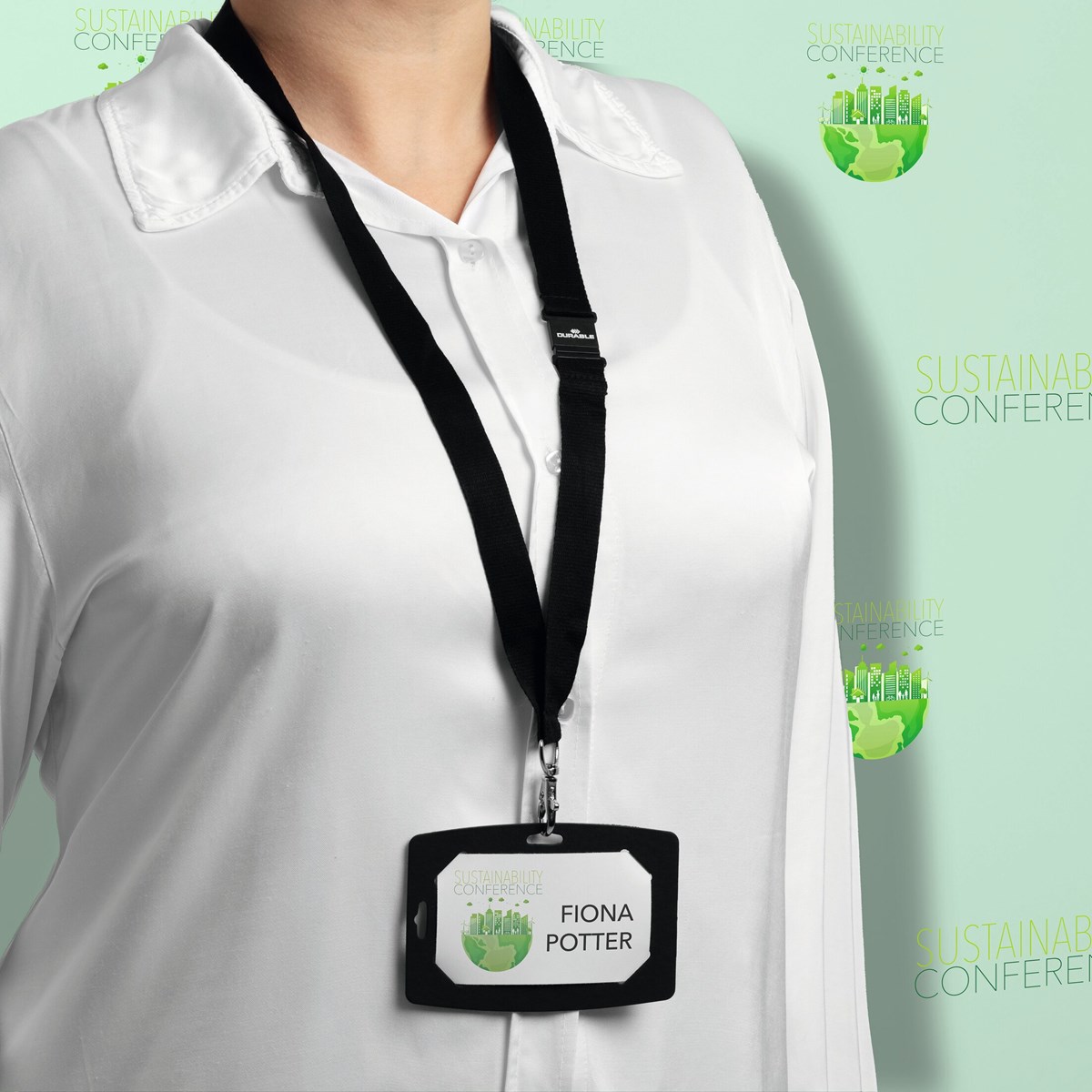 Namnskyltar till konferenser och event används oftast bara en gång. DURABLEs namnskyltar av 100% återvunnet pappersmaterial bidrar till att minska evenemangets miljöpåververkan och sänder signaler till deltagarna att arrangörerna tar hänsyn till miljön. När konferensen är slut sorteras namnskyltarna som pappersavfall. Använd skylten i stående eller liggande läge tillsammans med ett nyckelband i ett miljövänligt material.