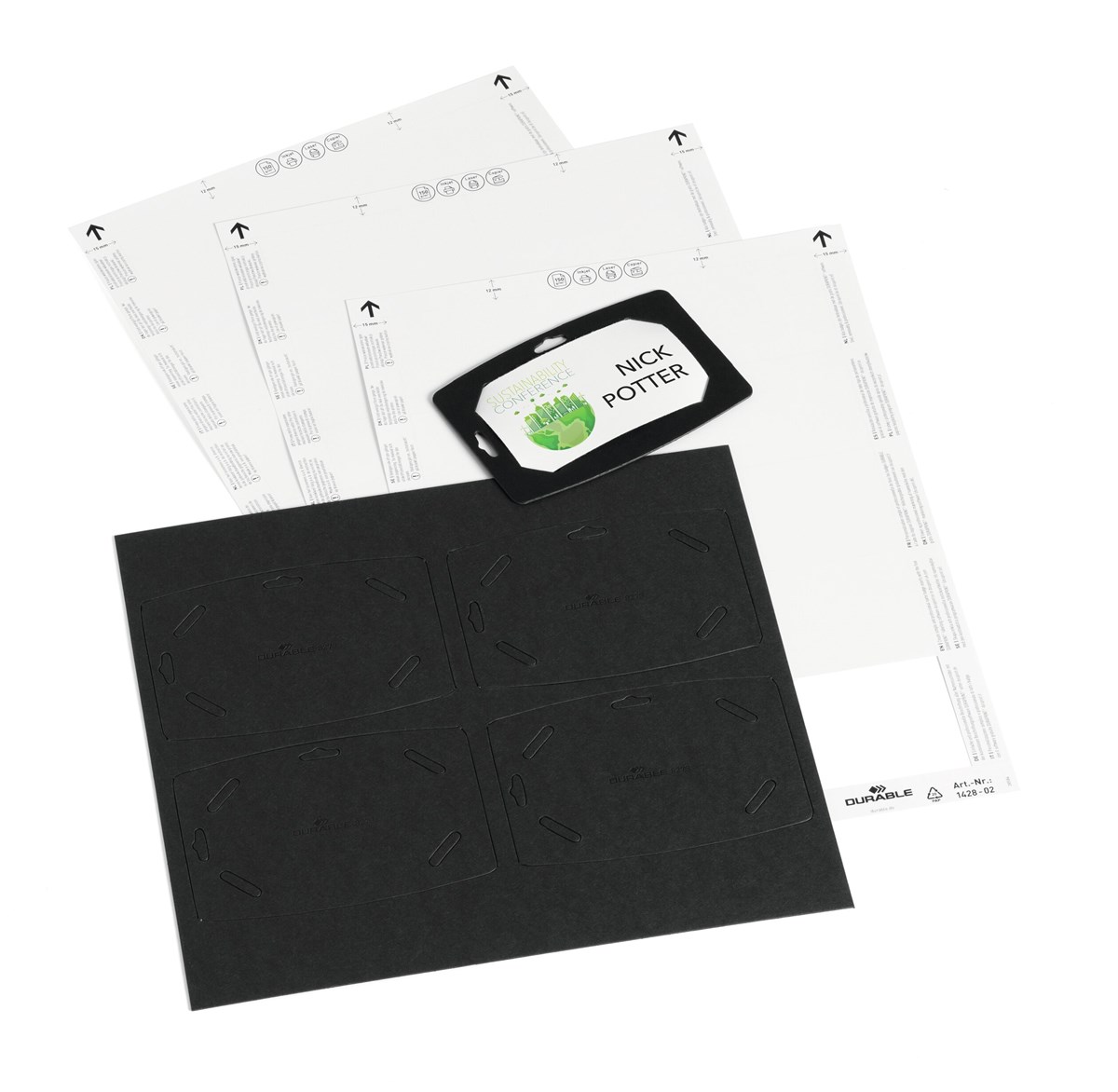 20 st namnskyltar samt 3 utskrivbara badgemarker A4-ark med insticksetiketter medföljer. Använd gratisprogrammet DURAPRINT® som finns på www.duraprint.se för att skapa och skriva ut snygga namnetiketter.