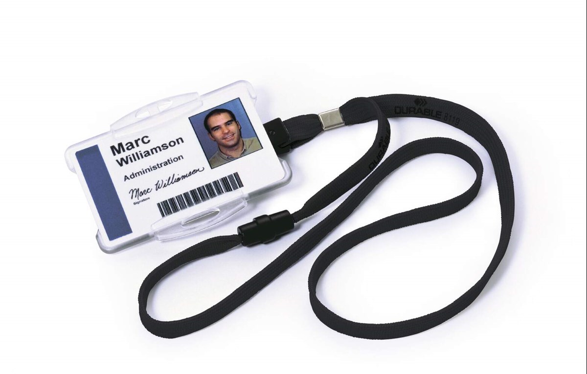 Textilhalsband med säkerhetsspänne som öppnas vid för stark belastning. Plastklämma för namnskyltar med stansat hål.