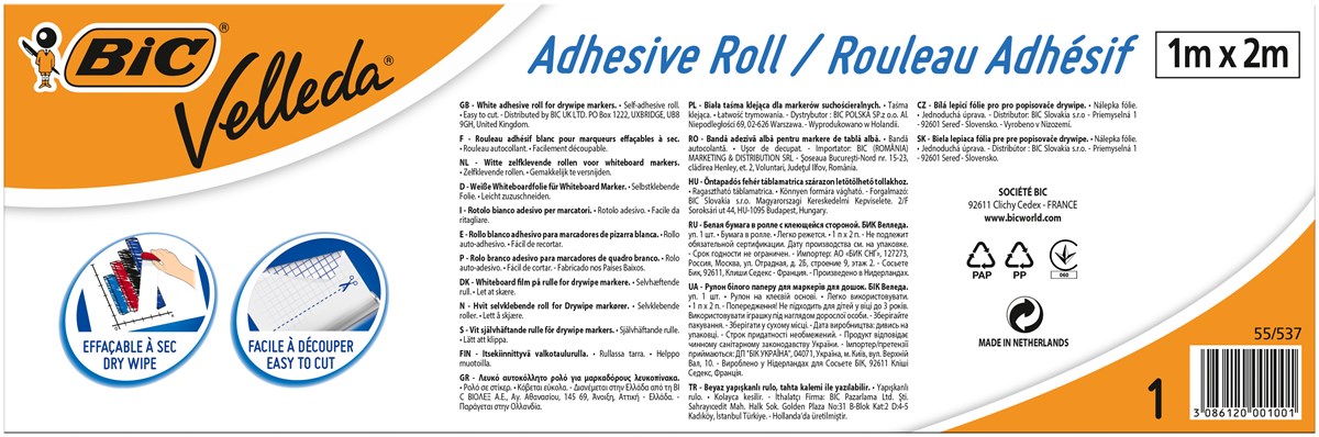 BIC Velleda whiteboardrulle som är en flexibel självhäftande torrraderingsyta. Du kan klippa filmen för att passa alla utrymmen. Fäster på vilken hård yta som helst som är ren och slät som en vägg eller ett bord.
