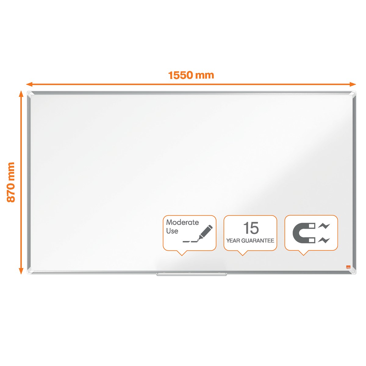 Modern snygg ramkant i aluminium runtom Fästes med en traditionell genomgående hörnmontering på väggen Stort pennfack för bekväm förvaring av whiteboardpennor och sudd Whiteboard yta med magnetiskt stål ger en ökad raderbarhet, för frekvent användning.