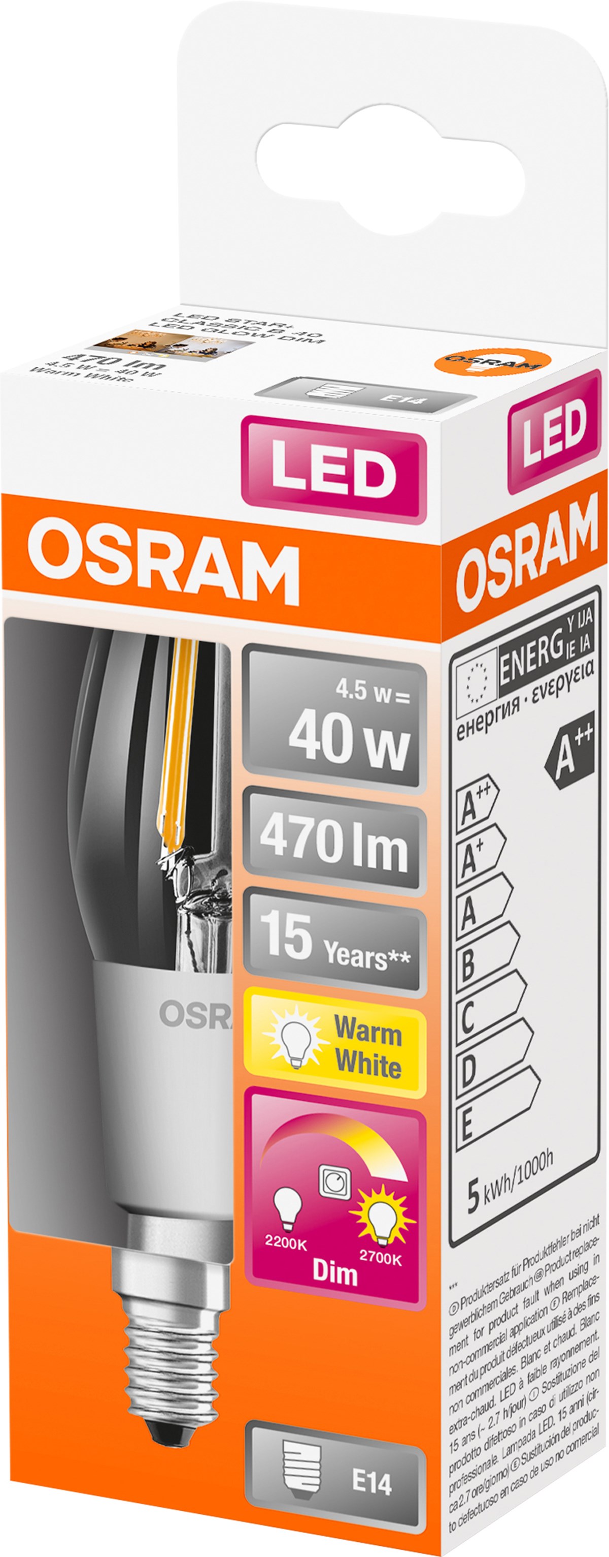 Dimbar LED-lampa i klassisk kronljusform med GLOWdim-effekt. Ljuskällan ger ett särskilt varmt ljus när det dimmas ner. Dimning ändrar ljusfärgen från varmvit (2700 K) till extra varmvit (2000 K). Dimningen styrs direkt från en standarddimmer, ingen fjärrkontroll behövs. Kan enkelt kombineras med andra GLOWdim-produkter i en applikation. Perfekt för bostadsinteriörer, hotell och restaurang, historiska byggnader och marinbelysning. Kan användas utomhus endast i utomhusarmaturer, minst IP65. Ljuskällan har låg energiförbrukning. Kan enkelt installeras i stället för vanliga glödlampor. Temperaturområde -20°C till +40°C.