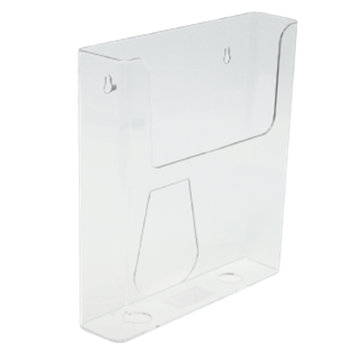 Broschyrbox som enkelt monteras på vägg. Stället är tillverkad i glasklar akryl och har ett fack.
