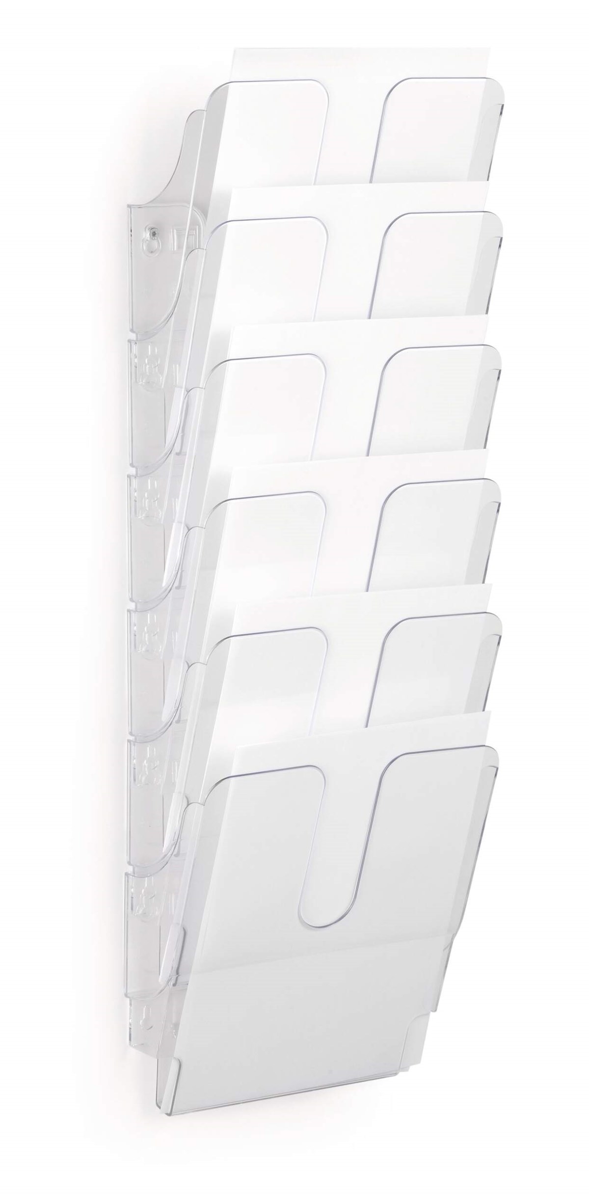 Blankettfack, broschyrställ, postfack - FLEXIPLUS är en serie med platsbesparande, flexibla och väggmonterade hållare för broschyrer, tidskrifter, blanketter och annan information i A4-format. Varje fack har en kapacitet på 24 mm tjocka buntar. Detta är ett komplett set med 6 fack i stående format där facken kan monteras ihop eller användas var för sig.