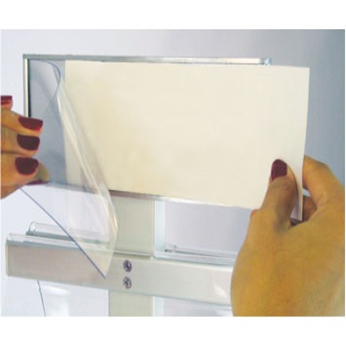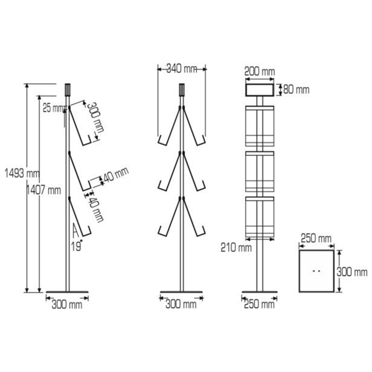 Broschyrställ med hyllfack i 3 mm akryl. 6 st A4-fack och topskylt. Silvergrå.