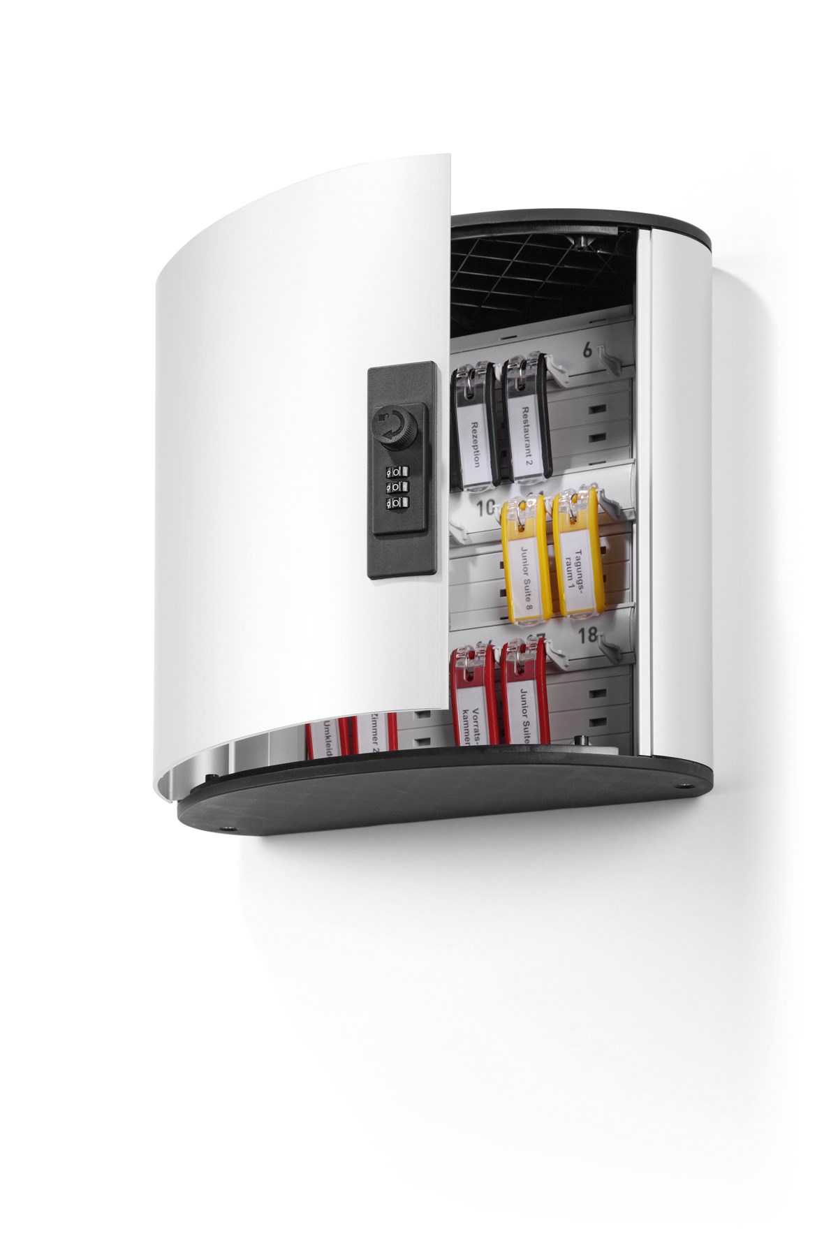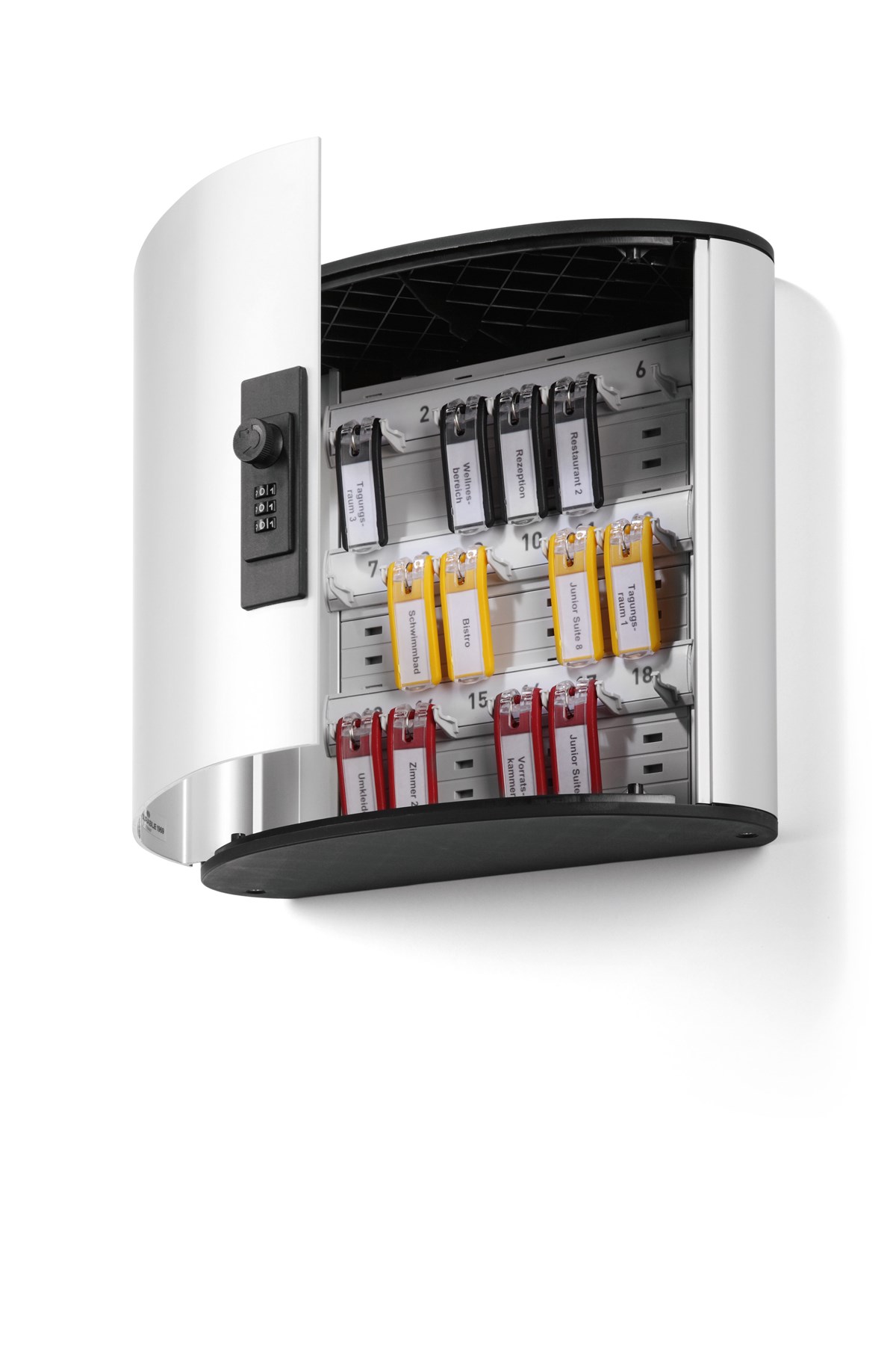 Skåp av aluminium. Kodlås med 1000 kodkombinationer. 6 st nyckelbrickor i blandade färger medföljer. Nyckeln hänger bakom brickan, vilket gör att etiketten alltid syns. Mallar för utskrift av etiketter till nyckelbrickor och nyckelförteckning kan laddas ner från www.durable.se.