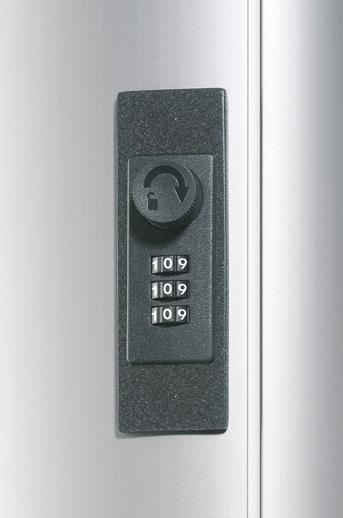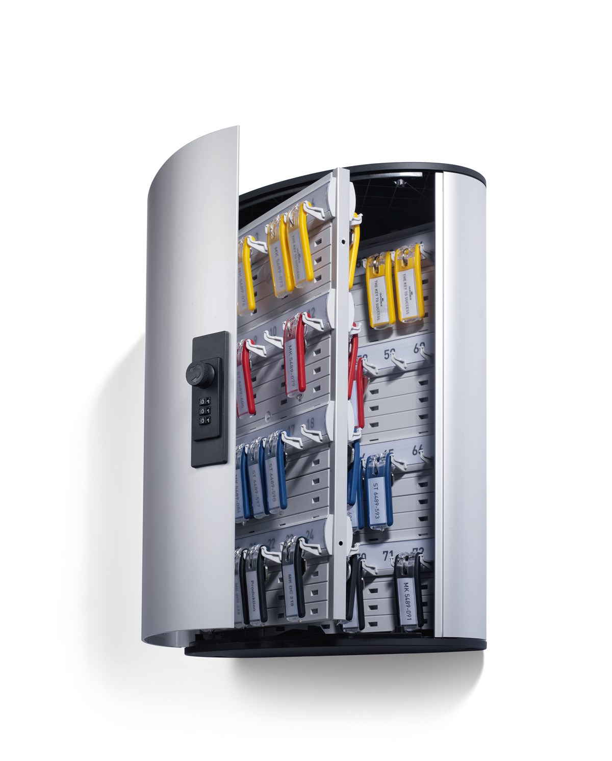 Skåp av aluminium. Kodlås med 1000 kodkombinationer. 6 st nyckelbrickor i blandade färger medföljer. Nyckeln hänger bakom brickan, vilket gör att etiketten alltid syns. Mallar för utskrift av etiketter till nyckelbrickor och nyckelförteckning kan laddas ner från www.durable.se.