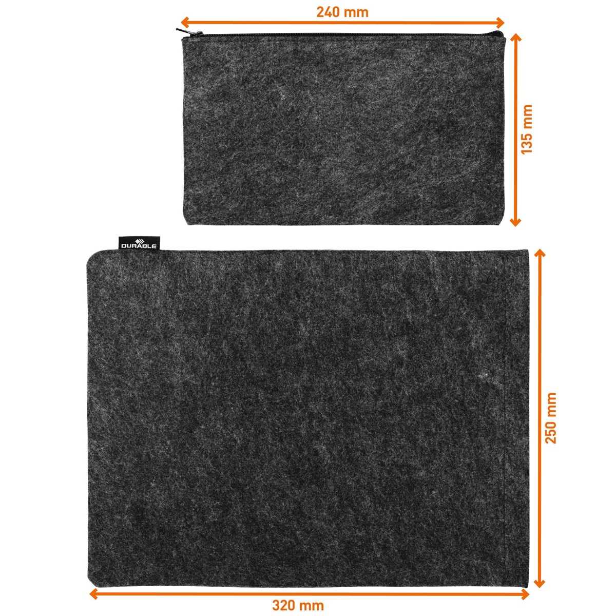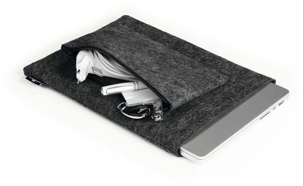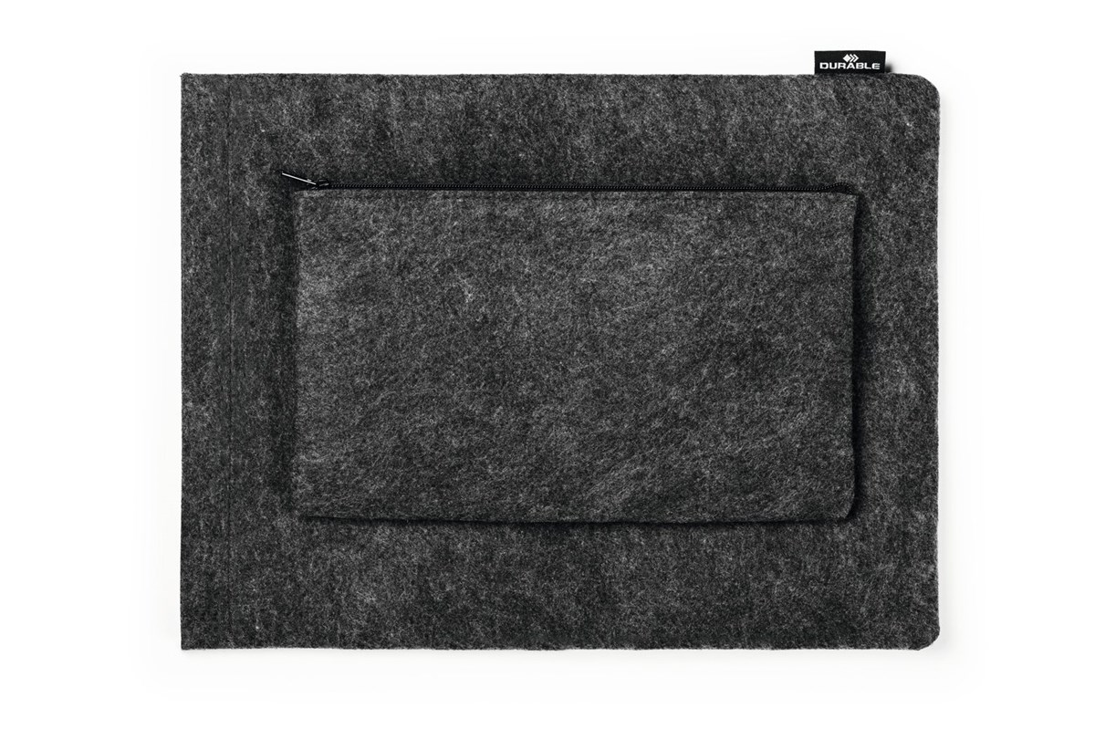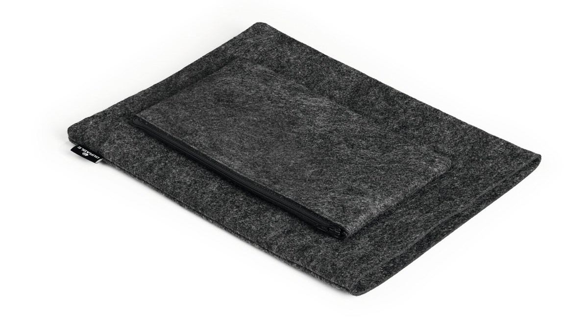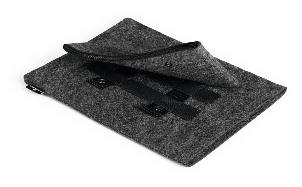 Skyddande fodral för bärbar dator eller surfplatta, tillverkat av 60 % återvunnen PET-filt. Kan kombineras med medföljande tillbehörsetui. Lätt och smidig, bekväm för daglig användning "på-språng", lätt att packa ner i ryggsäck, portfölj eller handväska. Filtfodralet med högkvalitativ dragkedja skyddar surfplattan eller laptopen från repor och skador. Etuiet och mobilfodralet fästs på laptopfodralet med tryckknappar.