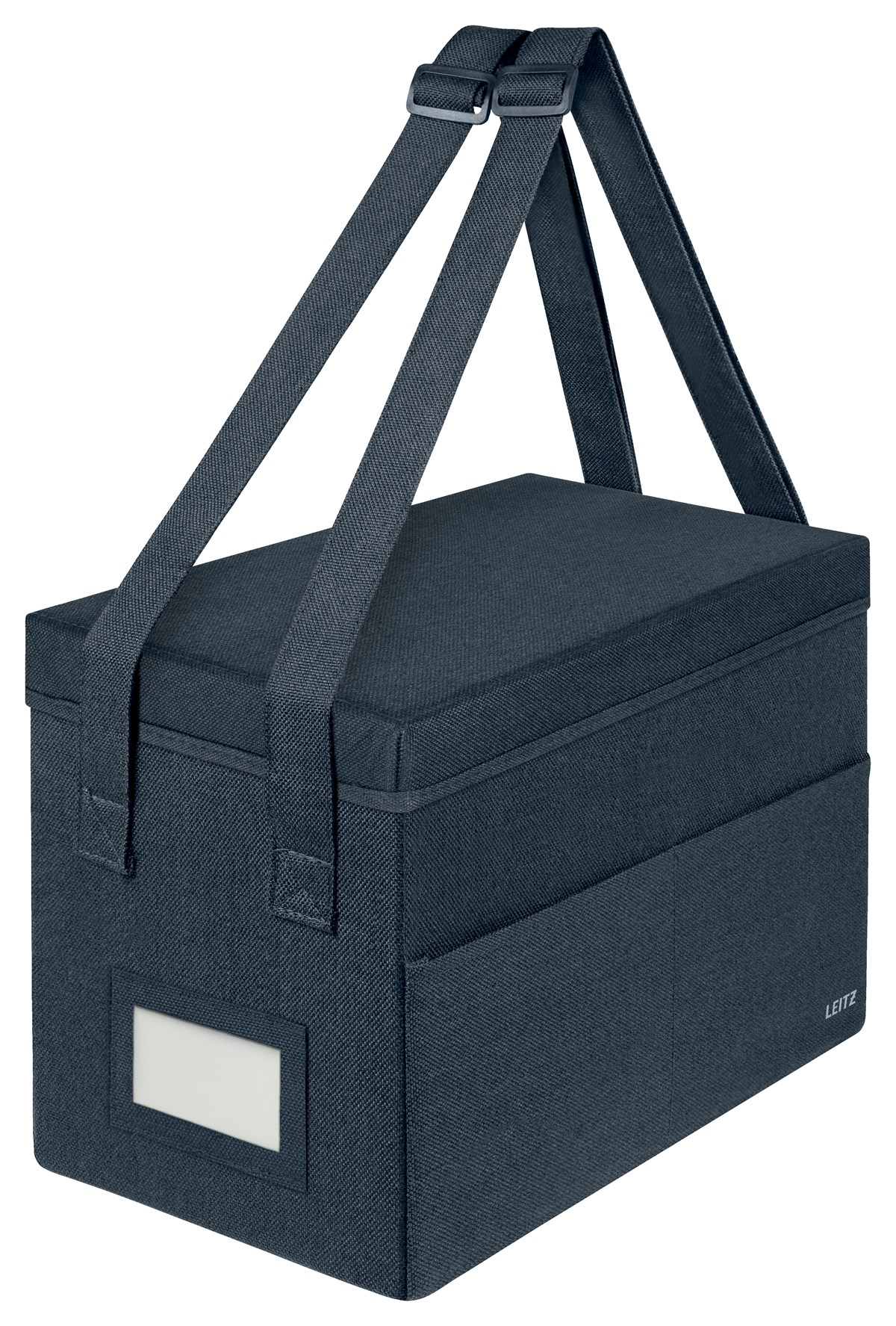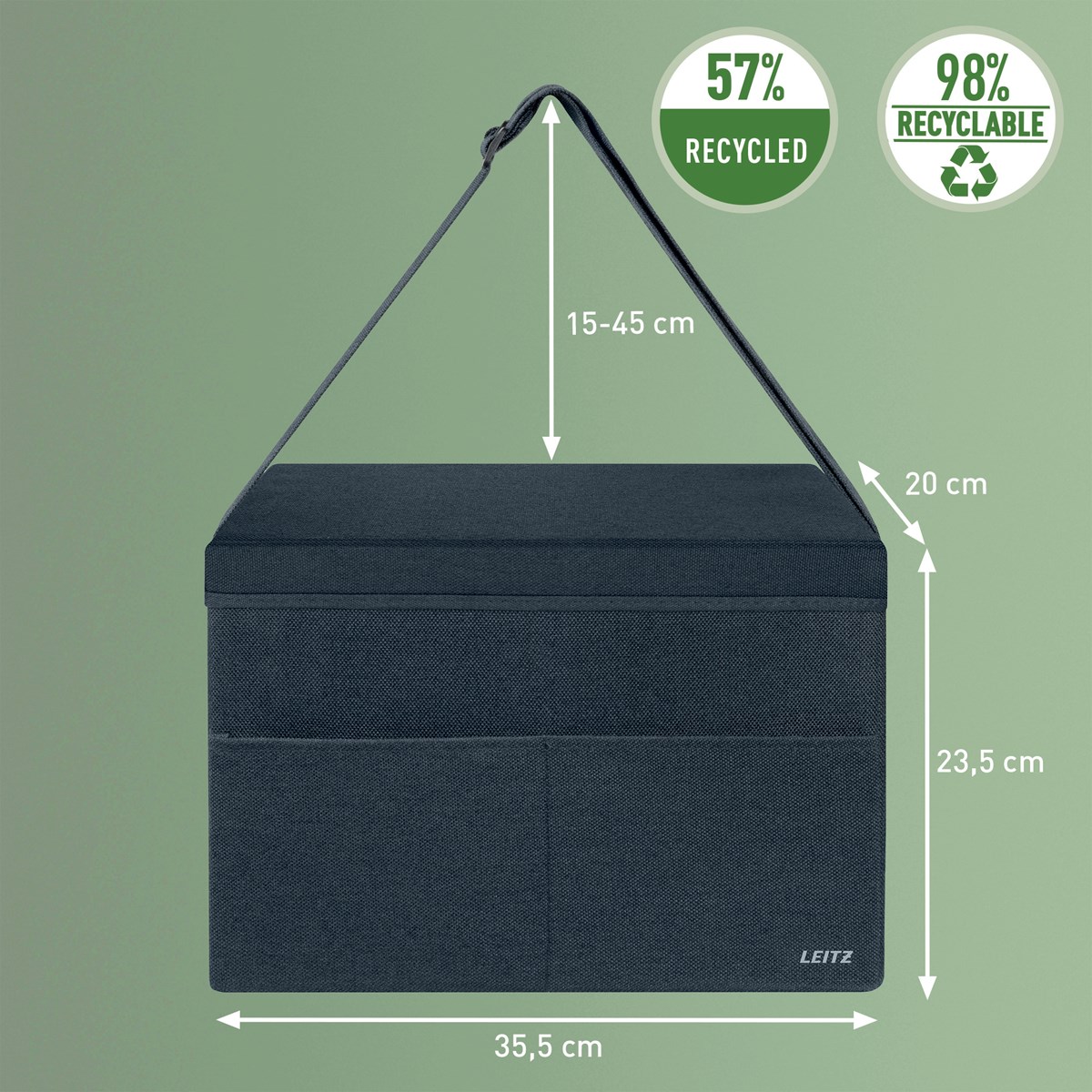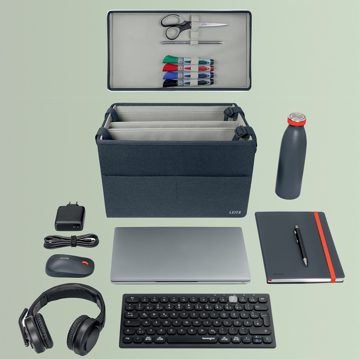 Med sin minimalistiska design och inbjudande matta gråa färg kan du på ett elegant sätt hålla ordning på kontoret, hemma, vid hybridjobb och överallt däremellan. Leitz Office-in-a-bag väska med lock har tre separata fack som gör att du kan förvara och bära med dig allt du behöver för kommande dag. Denna moderna och praktiska förvaringsväska har tillräckligt med utrymme för att rymma en bärbar dator upp till 16'', ett fullstort tangentbord, mus, laddningskabel, headset, bärbar dator och vattenflaska. Utrustad med ett lock som skyddar innehållet från damm eller oavsiktligt spill och hjälper till att bevara integritet och sekretess. Passar även som lärarväska. Tillverkad av mjukt material förstärkt med återvunnen kartong för styrka och hållbarhet. Totalt 57% återvunnet material. När den inte används är väskan helt hopfällbar för enkel förvaring. Namnetiketten som medföljer väskan gör att du enkelt kan identifiera den i delade utrymmen. Denna hot-desking-väska, med justerbara bärhandtag, är det perfekta komplementet till ditt hem, kontor eller skola för att säkerställa att du håller dig avslappnad och produktiv hela dagen.