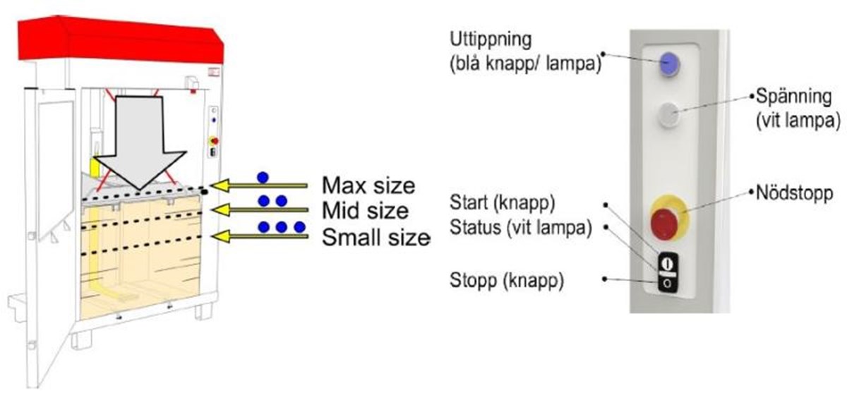 Mycket effektiv och driftsäker balpress lämplig för wellpapp och kartong, plastfilm och annat material som kan hanteras i balform. Plug´n Press - styrsystemet övervakar balpressen vid drifttagning och under drift. Stay´n Hold - pressplattan förblir stående i nedre läget (med full presskraft) och pressar ihop balen - för ännu kompaktare balar. Detta utan elförbrukning. Autostart - pressningen startar efter stängning av inkastluckan. På detta sätt är maskinen snart redo för nästa påfyllning. Både funktionen Autostart och Stay´n Hold kan slås av/på. Presstryck (kN): 60 Balvikt (kg): 40 – 80 Balstorlek (l/b/h) (mm): 500 x 700 x 700-800 Inkastöppning bredd x höjd (mm): 700 x 500 Inkast höjd över golv (mm): 820 Antal bandrullar (st): 2 Storlek (b/d/h) (mm): 960 x 700 x 1790 Totalvikt kg: 360 Motor: 1,5 kW / 400 V / 50 Hz Elkabel: 3.3m medföljer Ljudnivå dB(A): 57