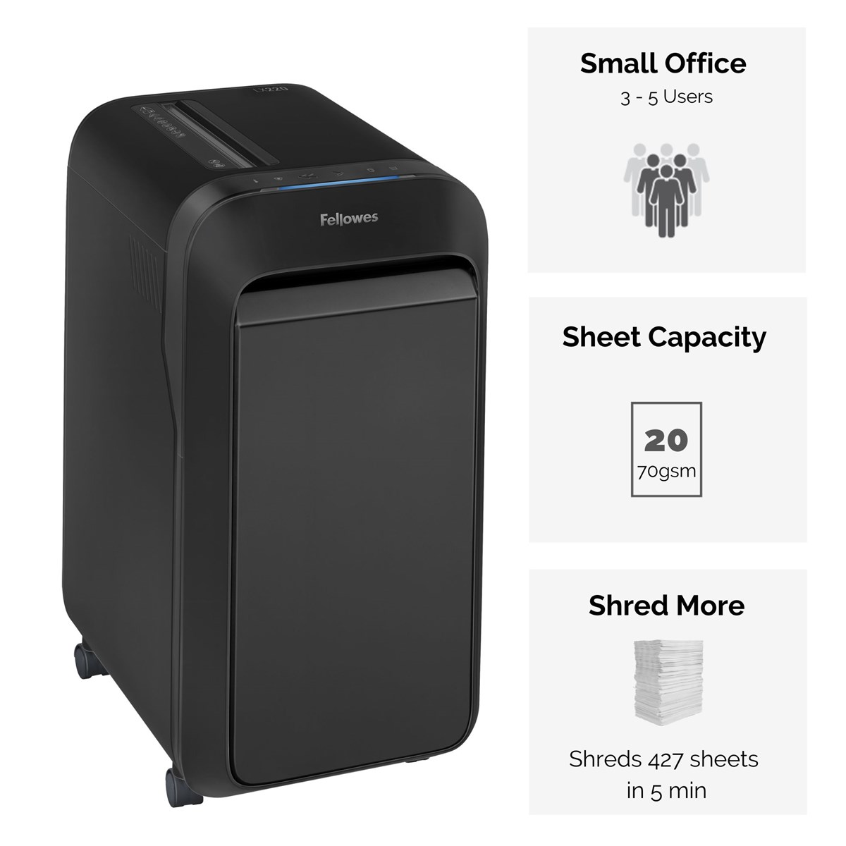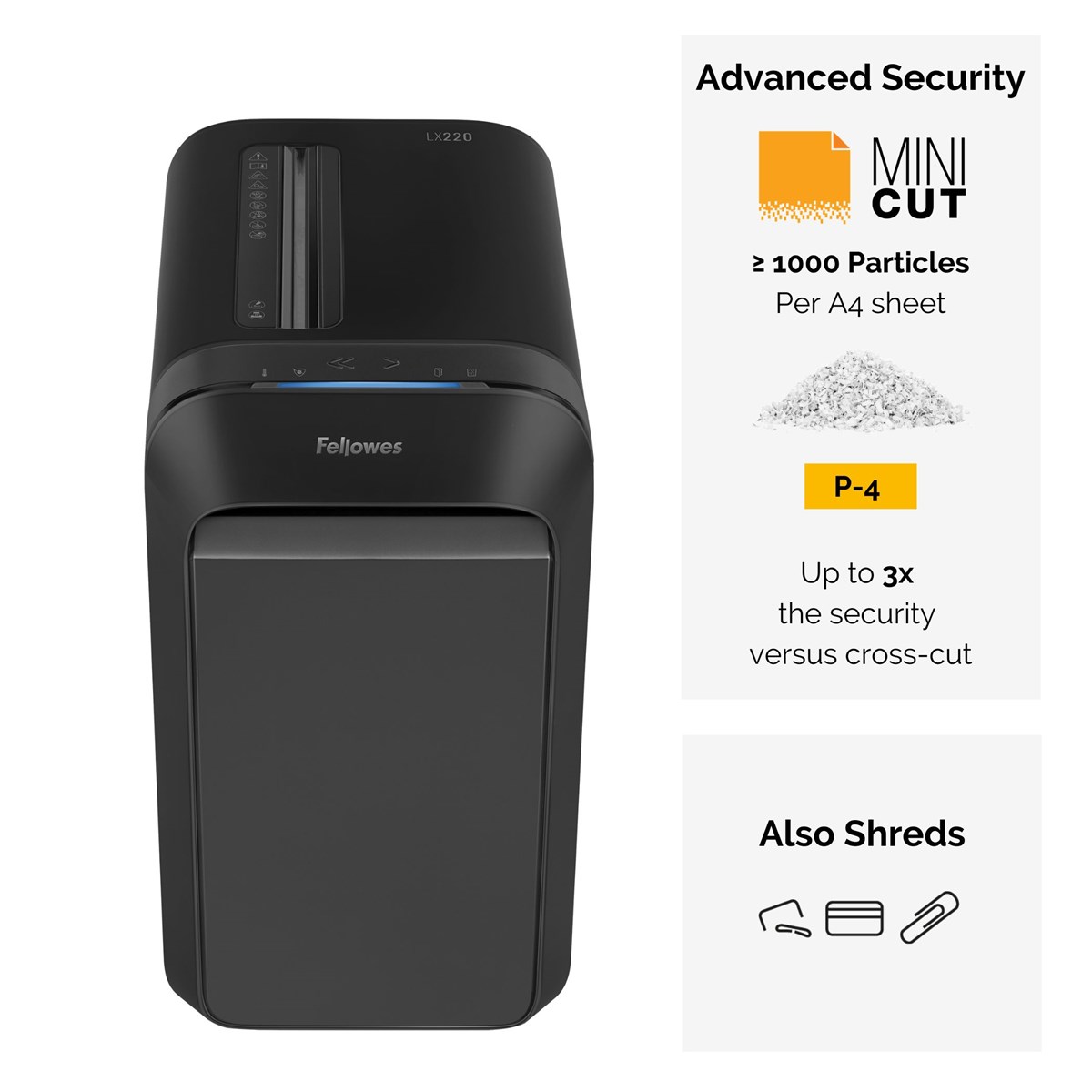 Fellowes LX220 dokumentförstörare har en lång körtid och passar bra på ett mindre eller mellanstort kontor med ett stort makuleringsbehov och högt säkerhetsfokus. Strimlar upp till 20 ark åt gången till mycket små 4x12 mm strimlor (Mini cut), säkerhetsklass P-4.