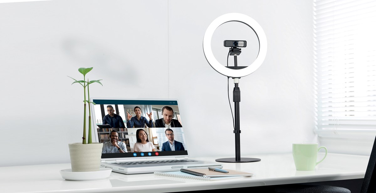 Tvåfärgad ringbelysning med fäste för webbkamera som snabbt förbättrar hur du ser ut i konferenssamtal. Stor temperaturintervall (kall, naturlig eller varm). Stegvis inställning av ljusstyrka från 10% till 100%. Utrustad med ett fäste för webbkamera i mitten av ljusringen för att säkerställa en konsekvent perfekt ljusfördelning – även om du ändrar vinkeln på din webbkamera. Stativet säljs separat.