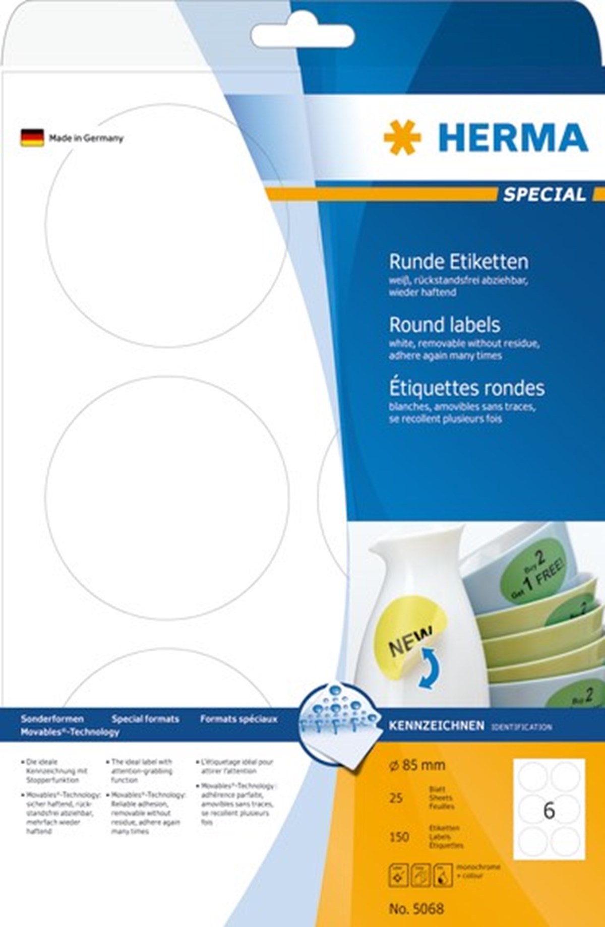 Flyttbara runda vita etiketter som fäster på alla släta, torra och rena ytor. Helt avtagbara utan att lämna rester. Perfekt för varumärkning, flyttkartonger, förvaringslådor, lagerplatser, tillfälliga skyltar etc. För laser-, inkjet- och matrisskrivare samt kopiatorer, även för färglaserskrivare och färgkopiatorer. 6 st/ark 25 ark/förpackning.