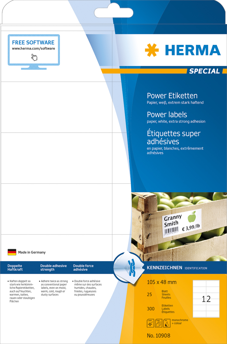 Etiketter med dubbel häftförmåga. Den rätta etiketten för högsta fästsäkerhet. Fäster dubbelt så starkt som vanliga etiketter, även på fuktiga, varma, kalla, skrovliga och dammiga ytor. Högkvalitativt etikettpapper. För laser-, bläckstråle- och kopieringsmaskiner. Tål saltvatten. 25 A4-ark/förp.