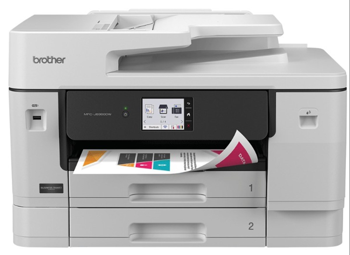MFC-J6960DW levererar förstklassig A3-utskrift, skanning, kopiering och faxning i en enda hållbar bläckstråleskrivare. Den har MAXIDRIVE-teknik som ger snabba utskriftshastigheter och jämnt hög kvalitet. Njut av flexibel pappershantering med två pappersfack för 250 ark, ett multifunktionsfack för 100 ark och en automatisk dokumentmatare (ADF) för 50 ark.