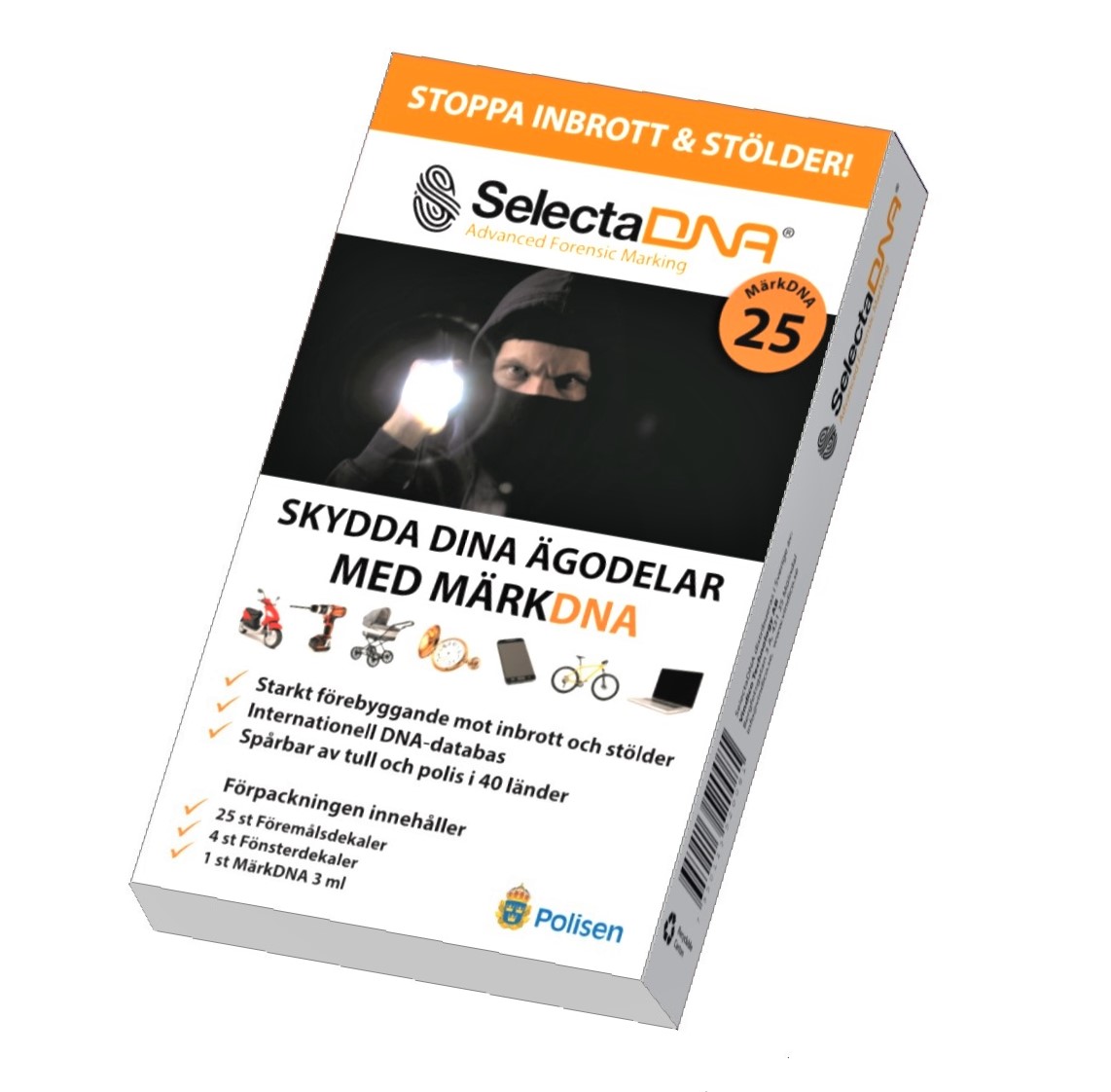 Stöldskyddsmärkning i form av en osynlig vätska som penslas på stöldbegärliga föremål. Varje produkt innehåller en unik DNA-kod och UV-fluorescens som gör det möjligt för polis att identifiera stöldgods och återlämna det till sin rätta ägare. Den unika DNA-koden registreras i ett internationellt register. Innehåll: märkvätska inkl. applikator, fönsterdekaler, objektsdekaler och svensk manual.