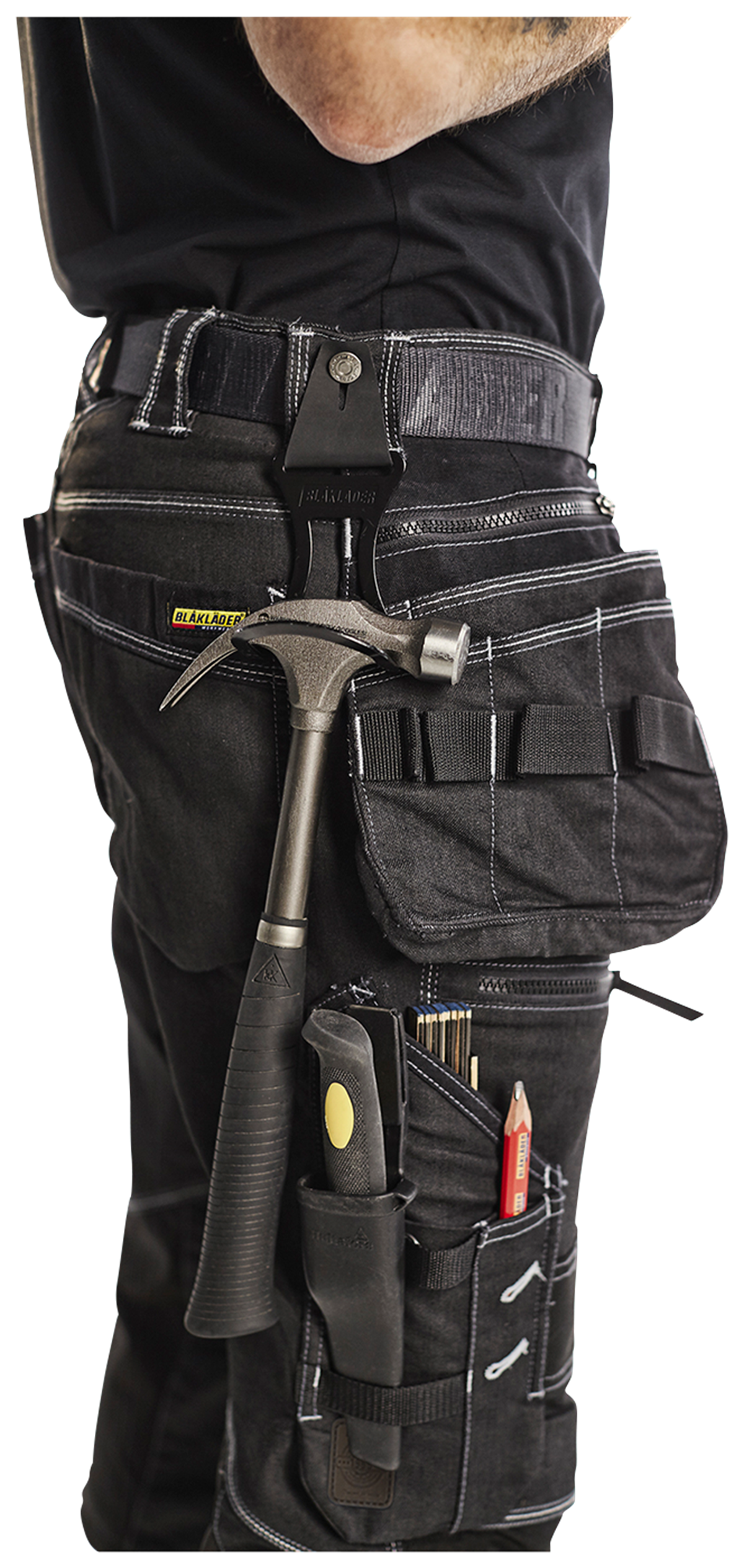 Stretchpanel i gren, vad och knäskyddsficka. Cordura 1000-förstärkta spikfickor, bakfickor och tumstocksficka. Cordura-stretch-förstärkta knäfickor. Gylf med knappar. Breda hällor bak och i sidorna. Två hällor med kardborre i sidorna för hammarhållare. Metallknappar. Knivhållare med knapp. D-ring i linningen. Förstärkt grensöm. Innerbenssöm med 3-nålsstickning. Bakficka med bälg. Benficka med bälg och lock med karborreknäppning samt en infälld telefonficka. Benficka med blixtlås. Insticksfickor. Knäskyddsfickor - Toppmatade med lock och kardborrestängning. Stretchmaterial både ut- och invändigt för bättre ergonomisk passform. Spikfickor - extra breda, försedda med verktygshankar och extra verktygsfack. Dragkedja för fasta eller lösa spikfickor. Förstärkt tumstocksficka med knivhållare och pennficka. Knäskyddsfickor anpassade till knäskydd 4027.Material: 55% bomull, 30% polyester, 15% polyamid, denimbelagd Cordura Denimstretch. Vikt: 340 g/m2.Oeko-Tex 100-certifierad.