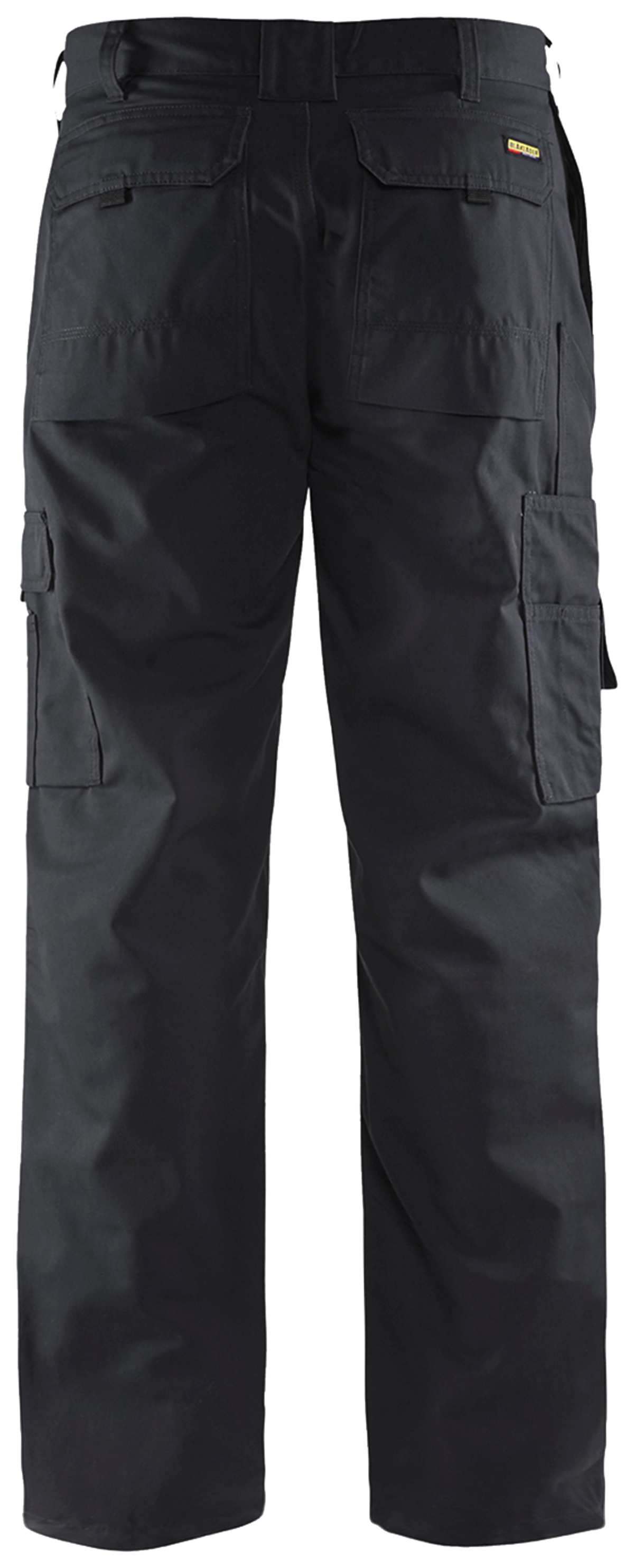 Tre framfickor, en med blixtlås. Bakficka med bälg och lock med kardborreknäppning. Benficka med tredelad pennficka och telefonficka. Tumstocksficka. Benficka med lock och tredelad pennficka. D-ring.Material: 65% polyester, 35% bomull, twill. Vikt: 240 g/m2.