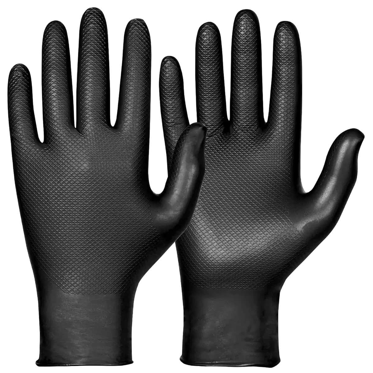Svarta engångshandskar som tål tuffa tag! Extra kraftiga och med ett fiskfjällsmönster på hela handen som ger ett fantastiskt grepp, t.ex. för dig som arbetar i oljiga miljöer. Godkända för såväl livsmedelshantering som kemikaliehantering.