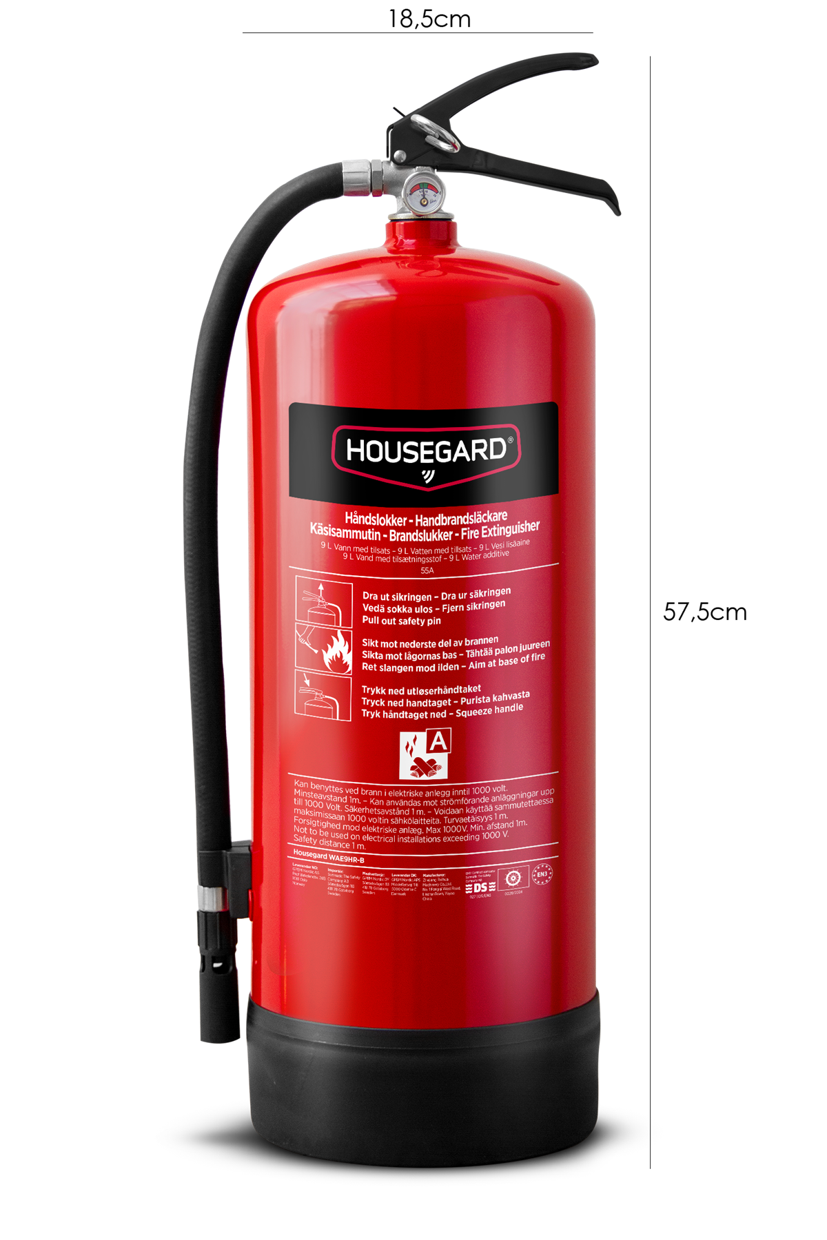 - Effektivitetsklass: 55A - Väggfäste ingår - Certifiering: SS-EN3, CE, Wheelmark - Temperaturområde: -0 °C / +60 °C - Vatten som släckmedel