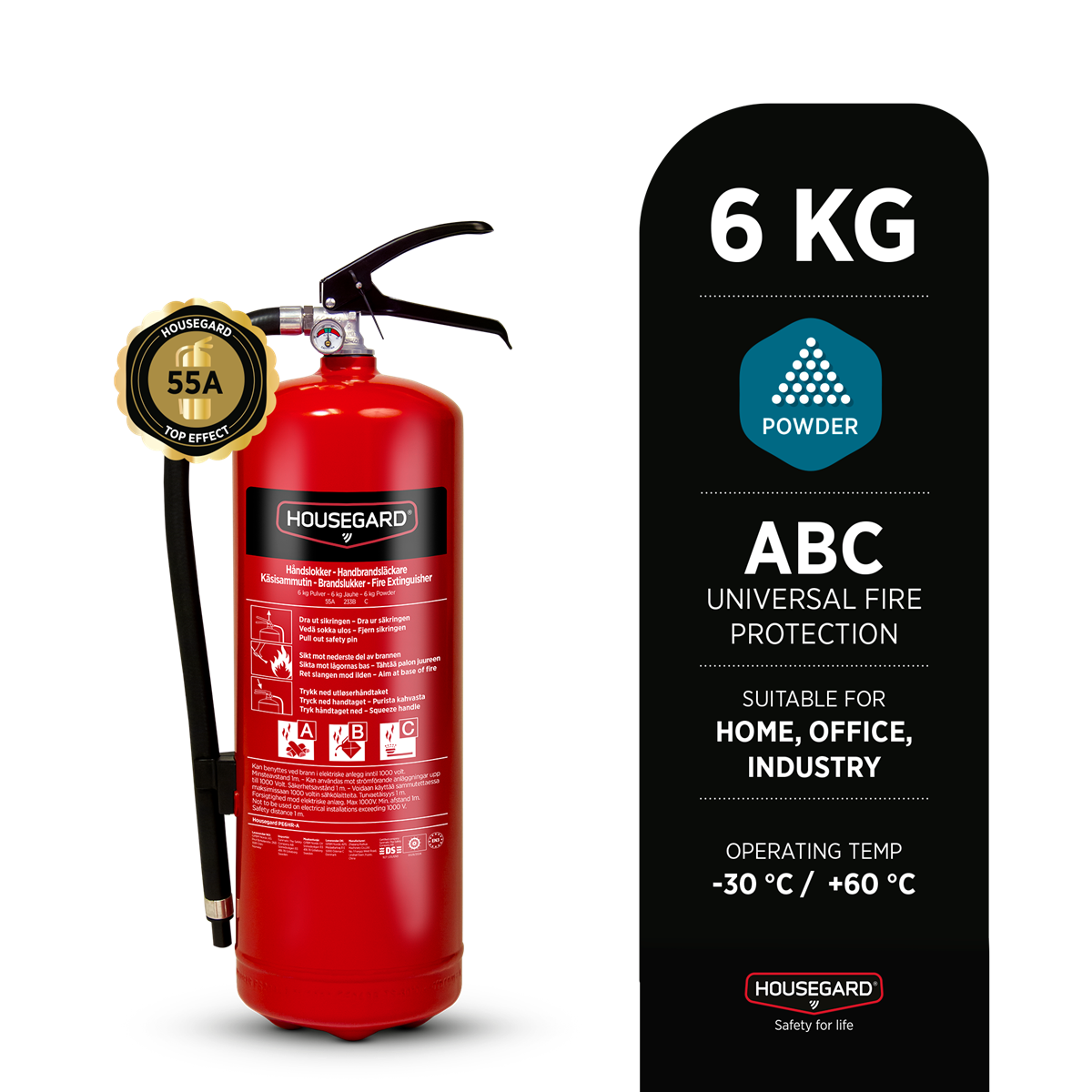 Det är skillnad på brandsläckare och brandsläckare, kompromissa inte med säkerheten. Ju högre släckeffekt en brandsläckare har desto större brand kan den släcka. Housegard 55A 6 kg pulver släcker de flesta typer av bränder, i så gott som alla material. Kompromissa inte med säkerheten, en dag kan brandsläckaren vara din viktigaste ägodel.