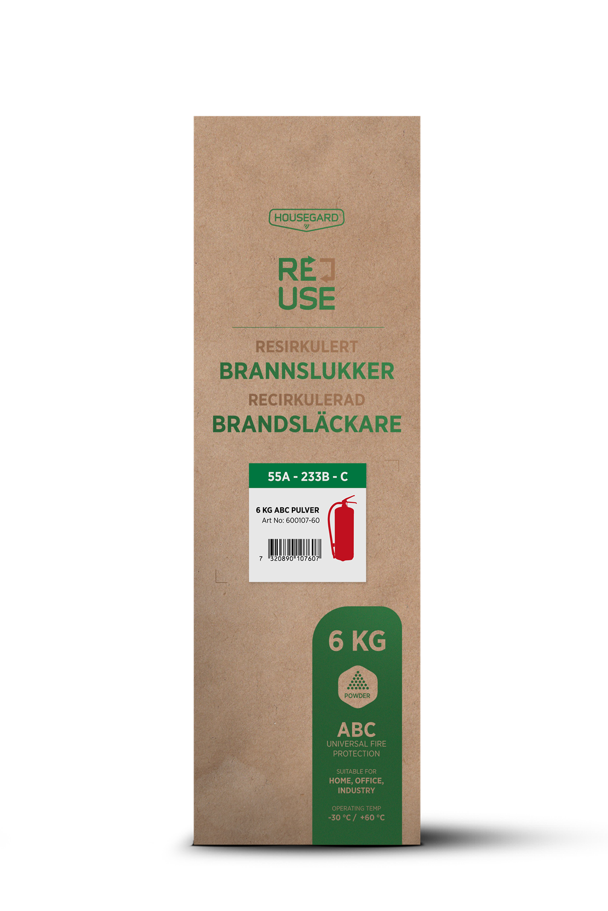 Housegard 55A 6 kg pulverbrandsläckare har effektivitetsklassen 55A, den högsta släckeffekten på marknaden. 6 kg pulverbrandsläckare är förstahandsvalet i alla bostäder men 6 kg pulversläckare rekommenderas även för placering i kontorsmiljöer, byggarbetsplatser och industrifordon.