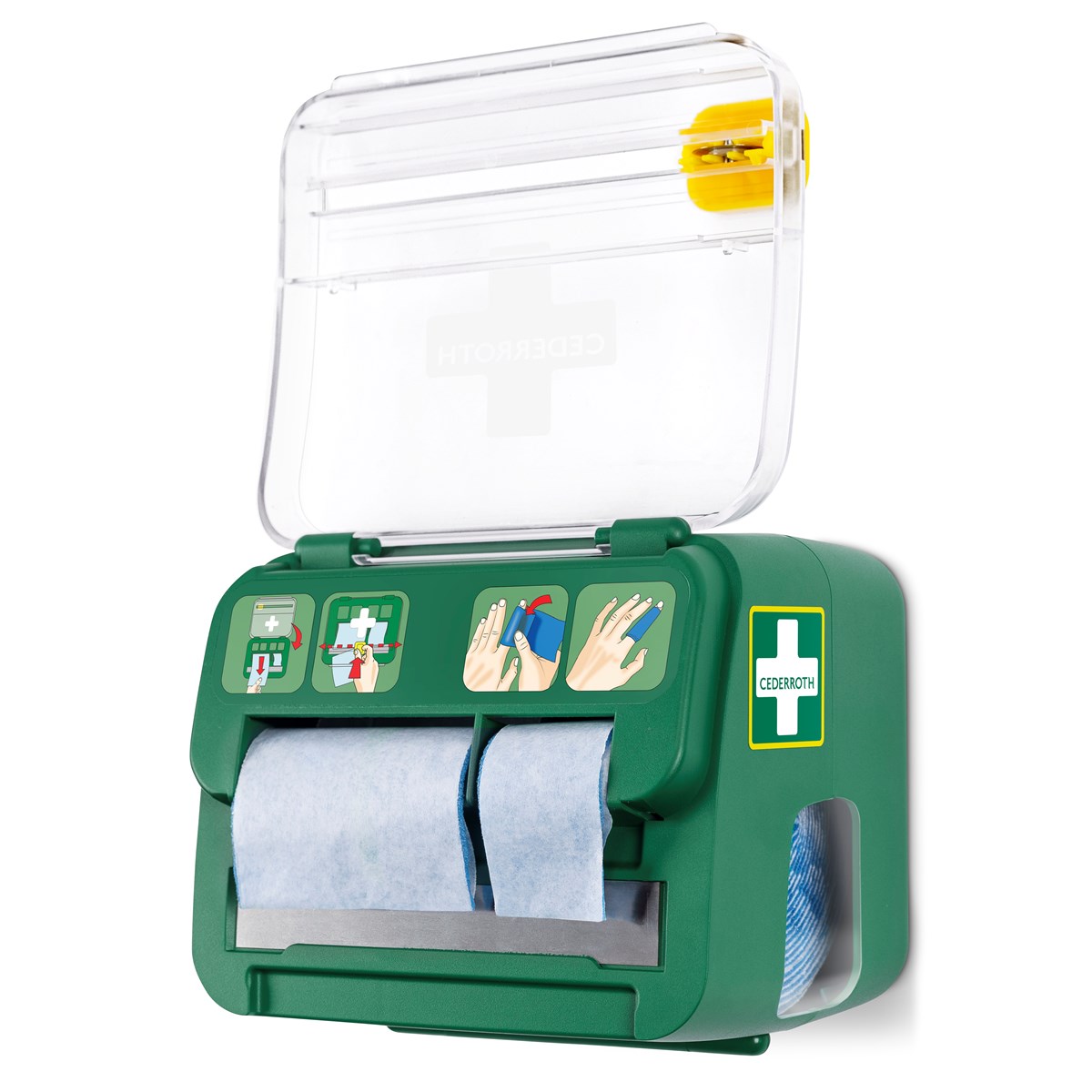 Två storlekar för flexibel sårvård och enkel åtkomst Enkel att montera på väggen bredvid din första hjälpen-utrustning Enkelt att se när påfyllning behövs
