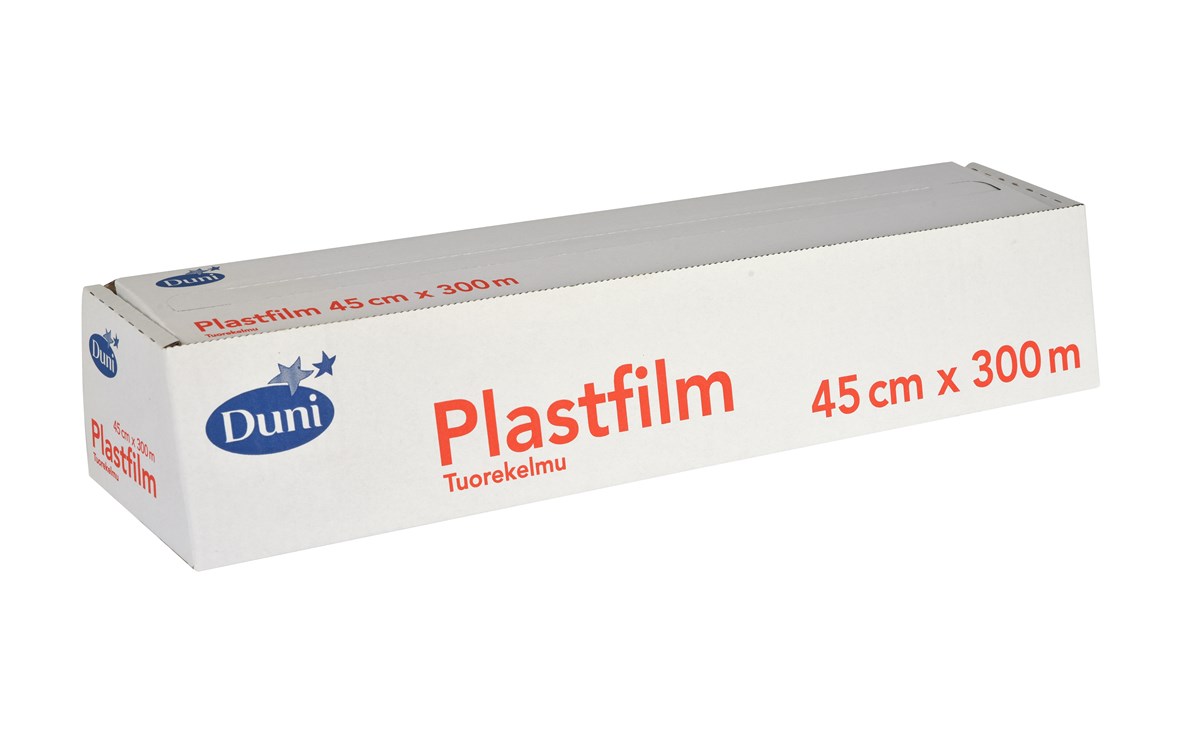 Plastfolie i en operforerad i dispenser med rivkant. PVC tål max +100°C. Plastfolie, plastfilm och gladpack. Den har många namn, och vi har den i vårt sortiment. Ett smidigt och enkelt sätt att hålla din mat färsk – dra bara lite plastfolie över maten och den sitter kvar på plats. Om du behöver något mer värmebeständigt vid ugnsbakning eller på grillen kan du i stället ta en titt på våra aluminiumfolier. Linda bara in maten i folie och börja skapa matmagi.