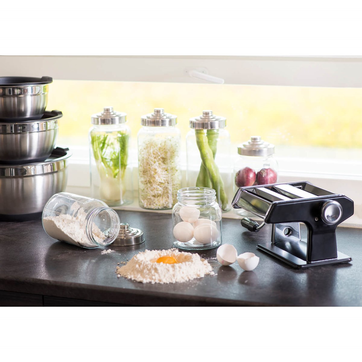 Detta set med tre rostfria skålar (4 L, 2 L och 1,3 L) är ett praktiskt tillskott i köket. Skålarna har halkfri botten för stabil användning och kommer med tättslutande plastlock som håller innehållet fräscht. Perfekta för både bakning och matlagning – och de tål maskindisk för enkel rengöring.