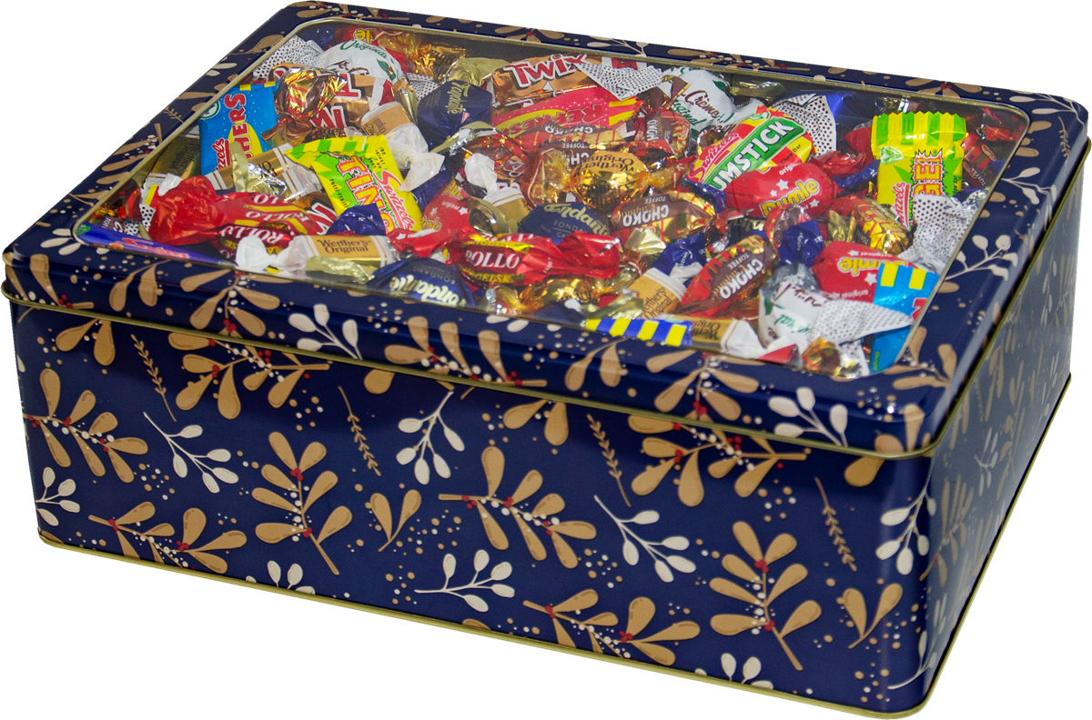 Julig dekorativ plåtlåda med ett fönster som visar det goda innehållet. När det goda tar slut finns där en trevlig julhälsning i botten.