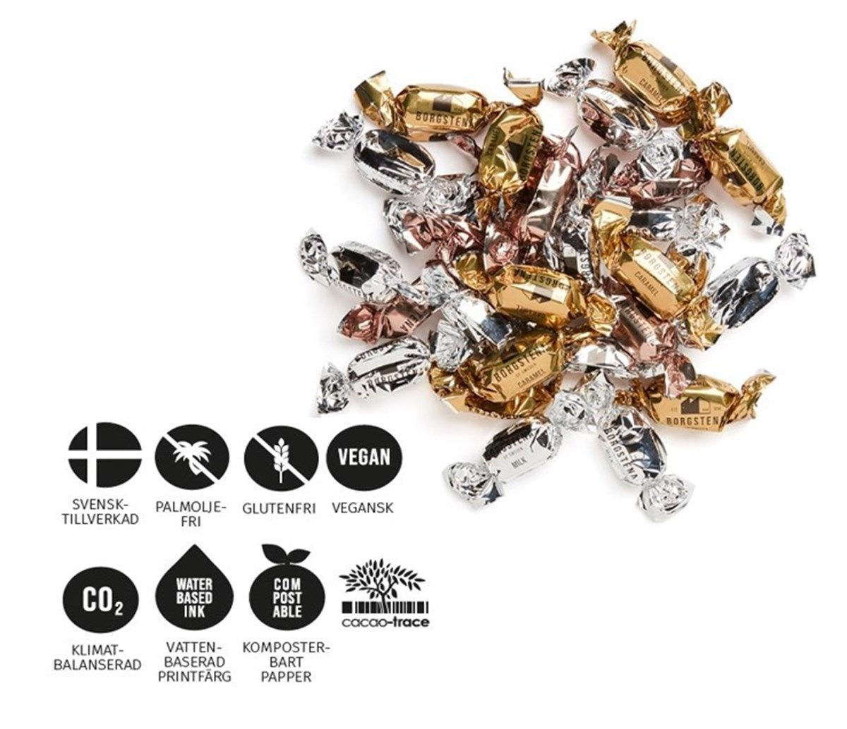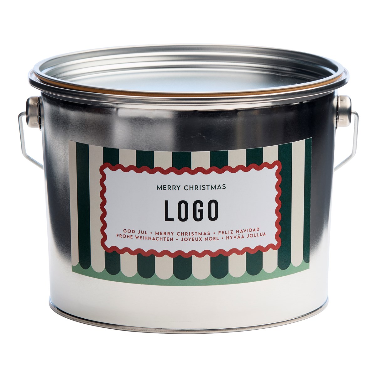 En snygg "målarburk" som sprider härlig julstämning. Fylld med 1 kg Cacao-Trace-certifierad choklad från Borgstena. Svensktillverkad och fri från både gluten och palmolja. Tryck din logga eller ditt budskap på produkten. Förpackningen har vattenbaserade färger, klimatbalanserad, kompsterbart papper.