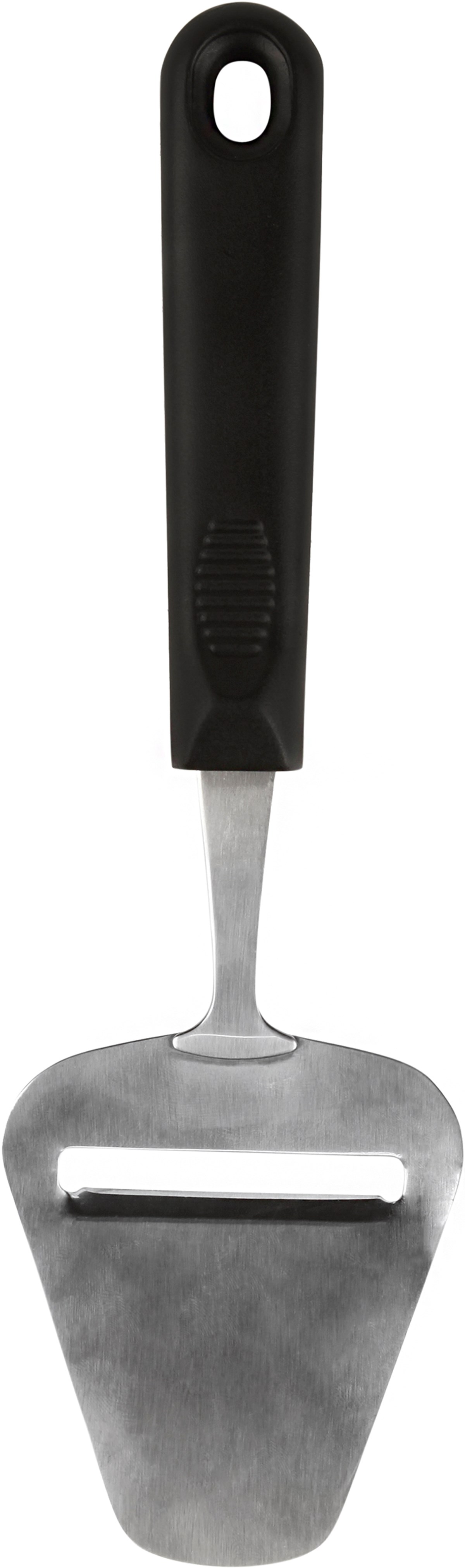 Klassisk osthyvel i rostfritt stål med svart plasthandtag.