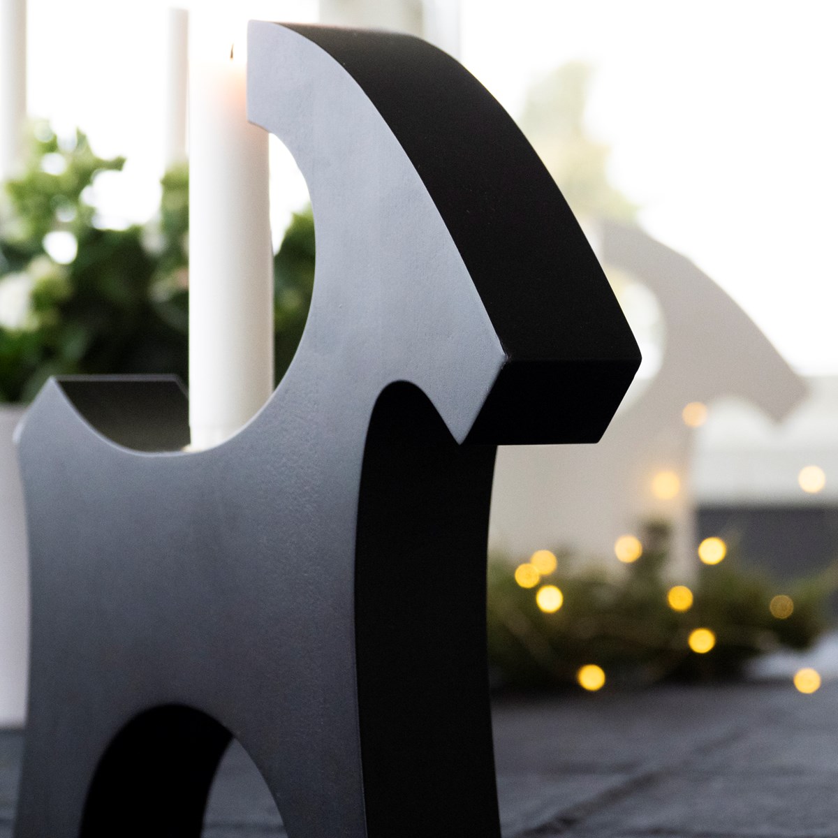 Svensktillverkade träbockar med metallinsats anpassad till kronljus. Höjd 23 cm, längd 25 cm.