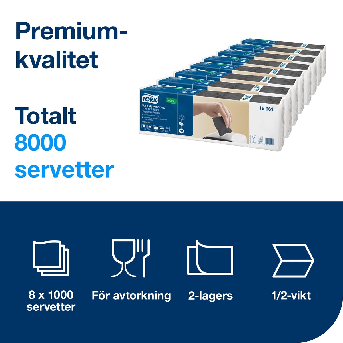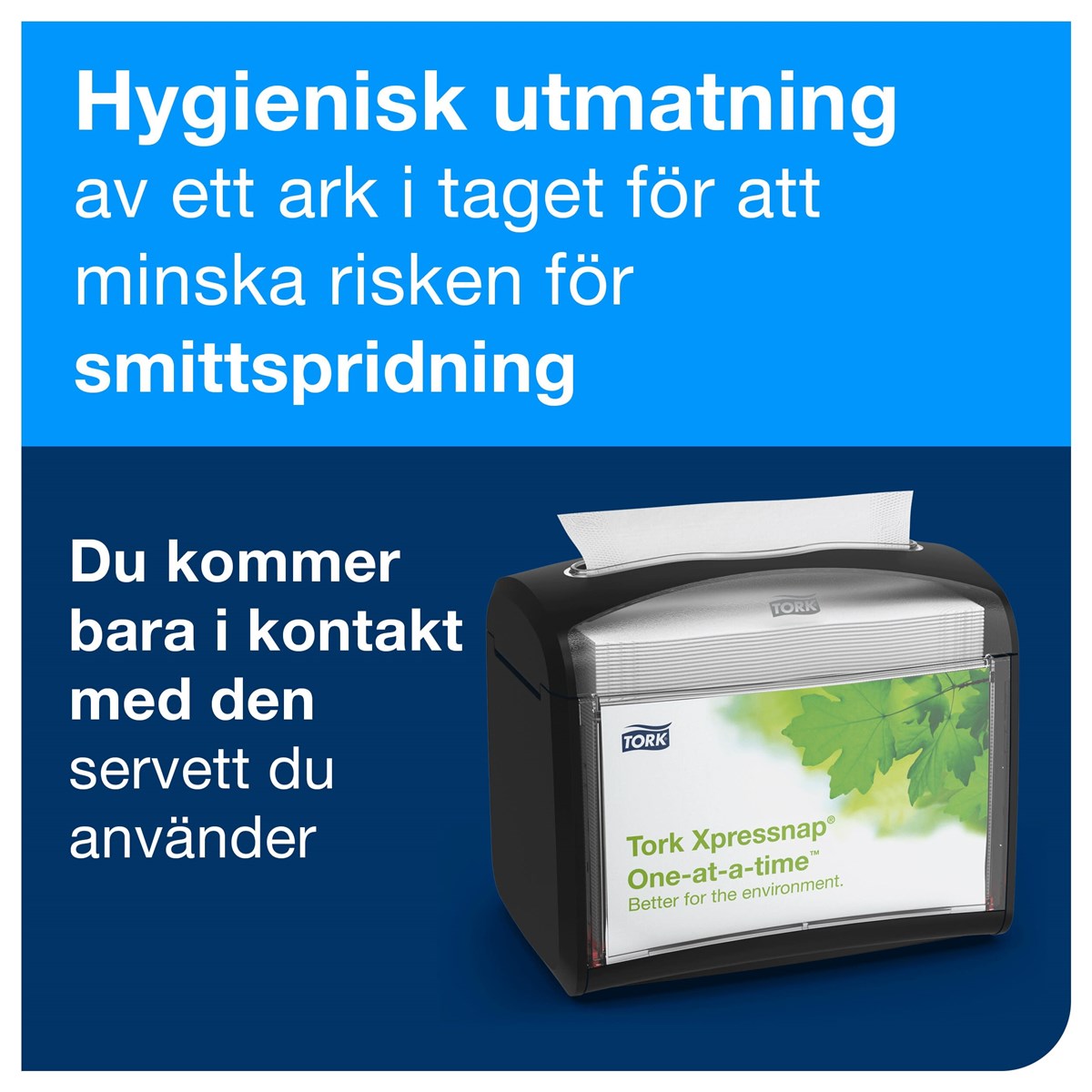 Tjock och mjuk servett för snacks Plastförpackning som skyddar och förenklar hanteringen Utmatning av ett ark i taget som minskar förbrukningen och förbättrar hygienen