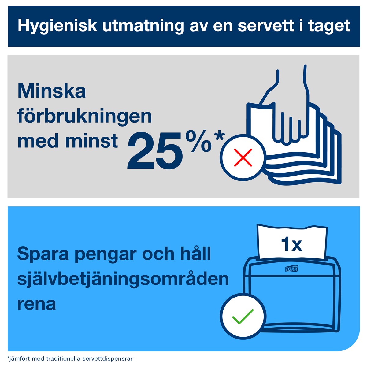 Tjock och mjuk servett för snacks Plastförpackning som skyddar och förenklar hanteringen Utmatning av ett ark i taget som minskar förbrukningen och förbättrar hygienen