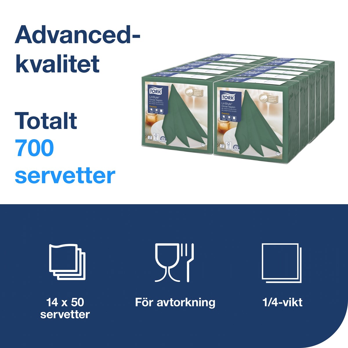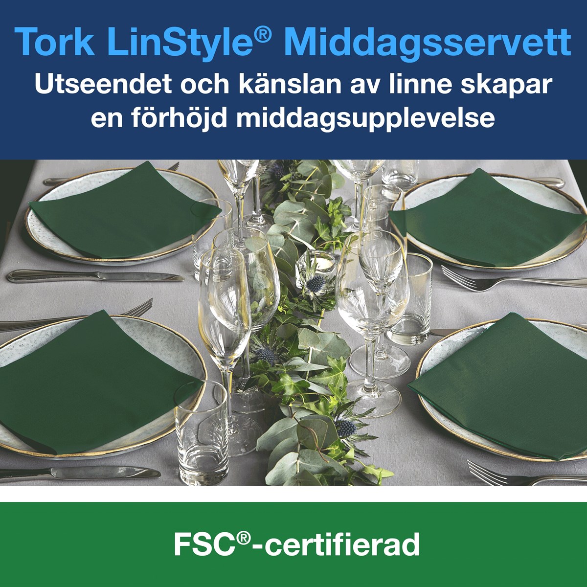 Gör ett gott första intryck i din fullbetjäningsrestaurang med högkvalitativa Tork LinStyle® Middagsservett. Dessa restaurangservetter ger ett lyft till middagsupplevelsen eftersom de både ser ut och känns som premiumlinne. Dessutom är de mjukare och tjockare än vanliga pappersservetter, så gästerna kommer att märka skillnad. Spill torkas enkelt upp på ett ögonblick med den extra absorberande kvaliteten som sparar personalen både tid och ansträngning. Mått vikt: 19,5x19,5 cm. Ovikt: 39x39 cm.
